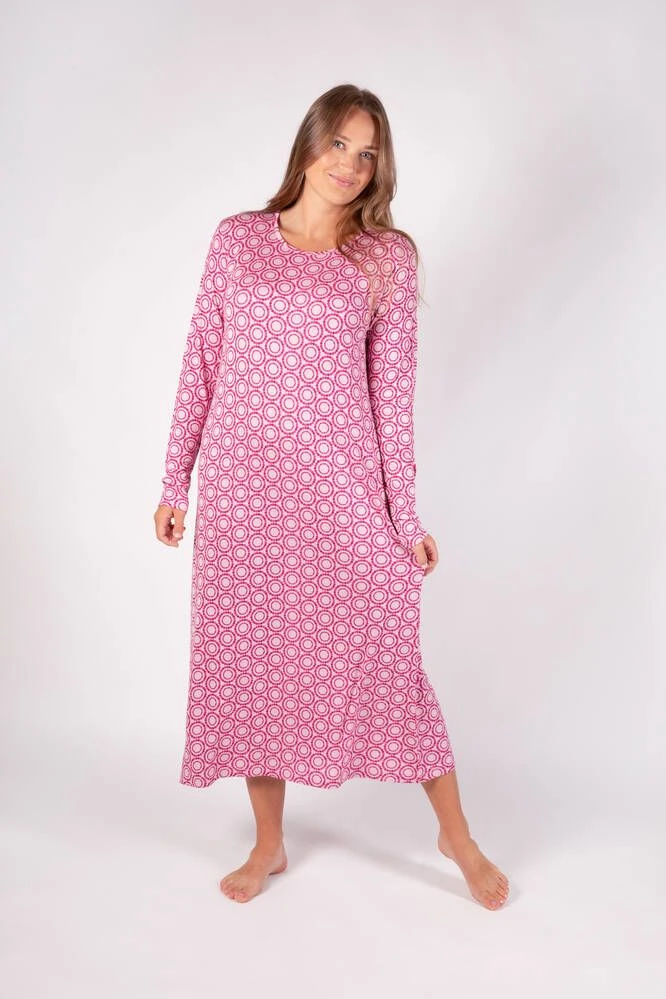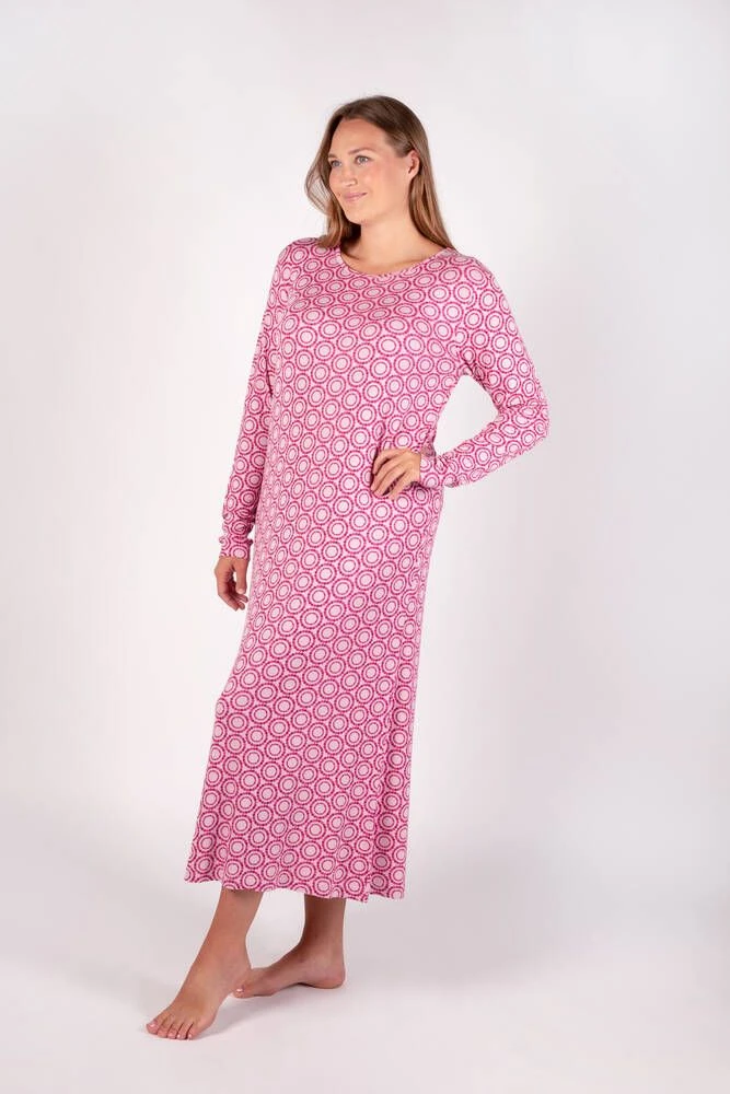 Naisten pitkä yöpaita pehmeästä kankaasta. Yöpaidassa on pyöreä pääntie ja pitkät hihat.