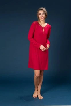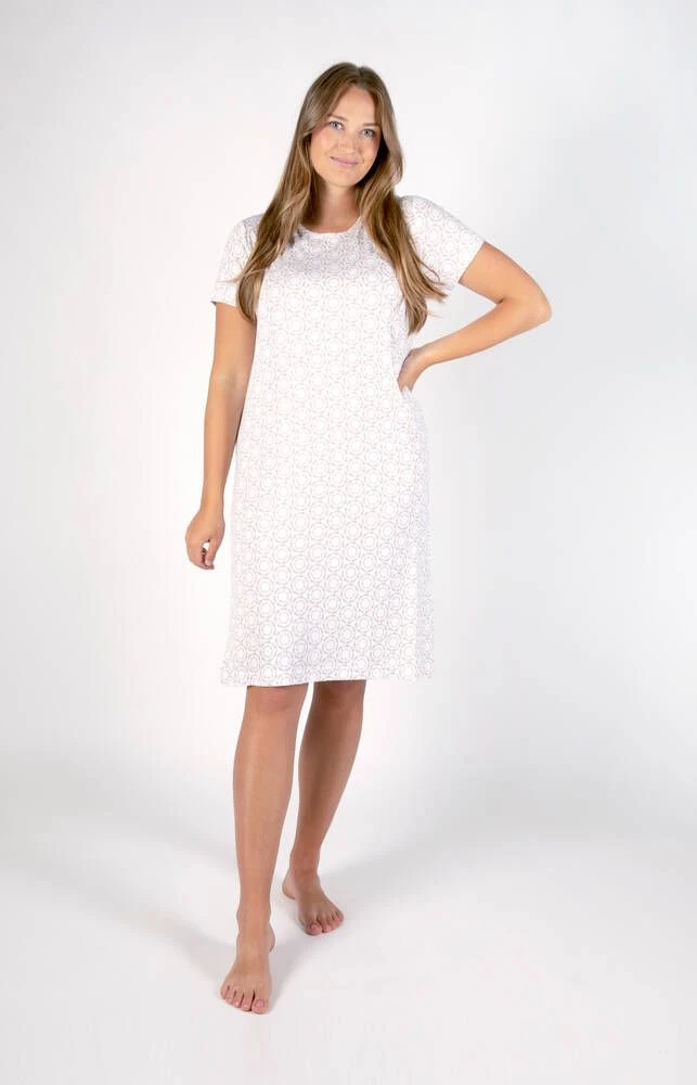Naisten yöpaita pehmeästä kankaasta. Yöpaidassa on pyöreä pääntie ja lyhyet hihat.