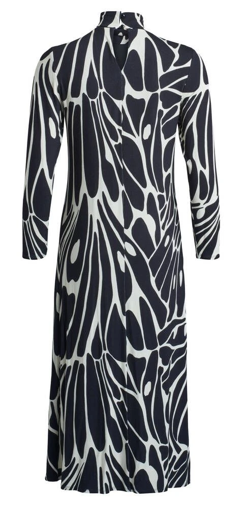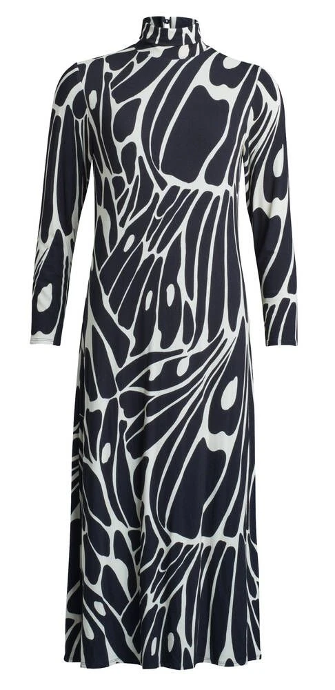 Naisten kuviollinen nilkkapituinen trikoomekko. Mekossa on poolokaulus ja pitkät hihat.