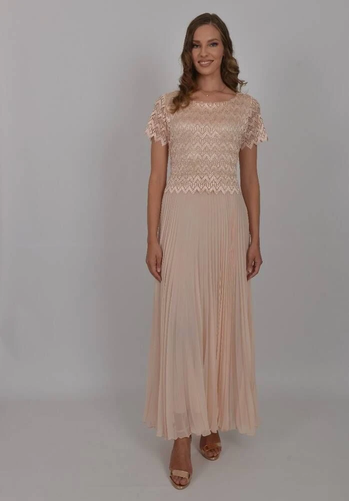 Naisten juhlamekko pitsisellä yläosalla ja pliseeratulla alaosalla.