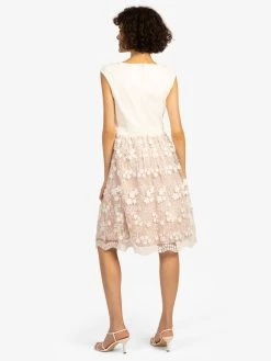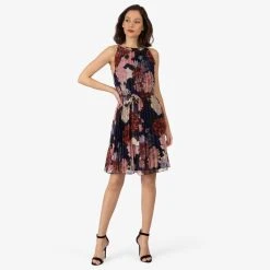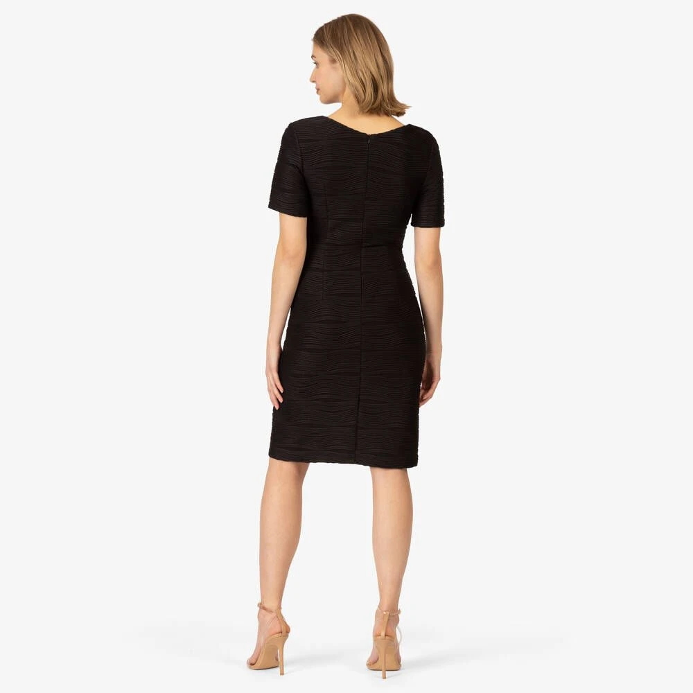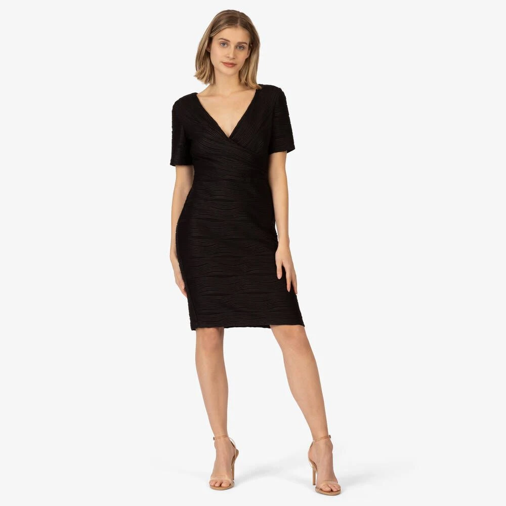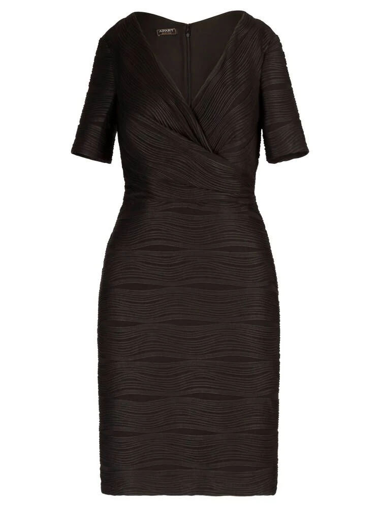 Naisten yksivärinen mekko aaltoilevalla struktuuripinnalla. Mekossa on syvä kietaisupääntie ja lyhyet hihat.