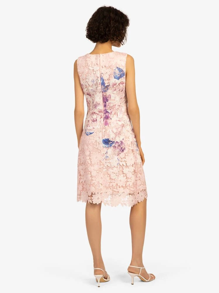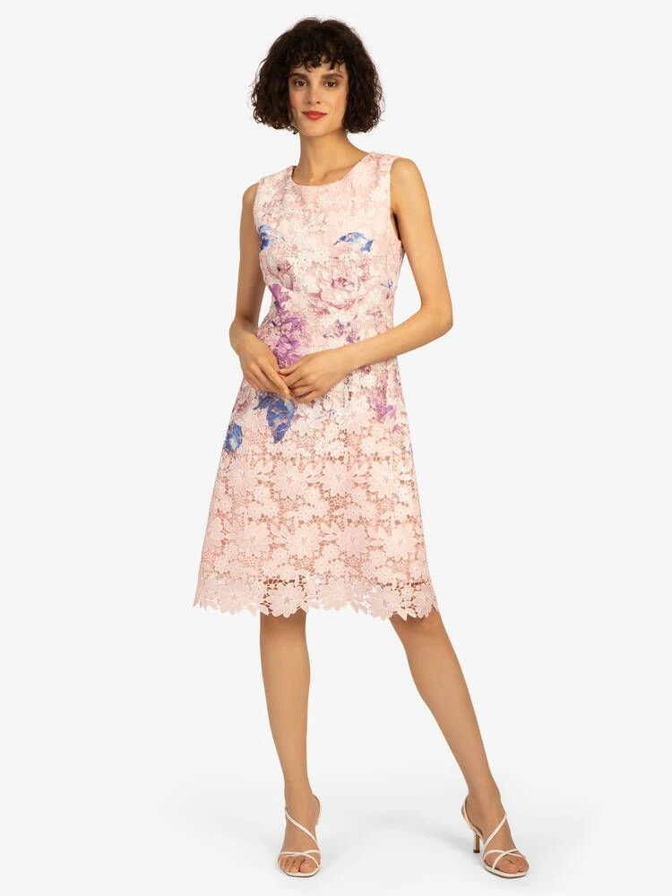 Kaunis pitsimekko selkäpuolen vetoketjukiinnityksellä. Hihattoman mekon pitsiin on painettu värikäs kukkakuvio.