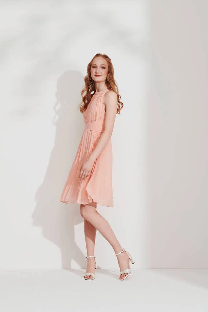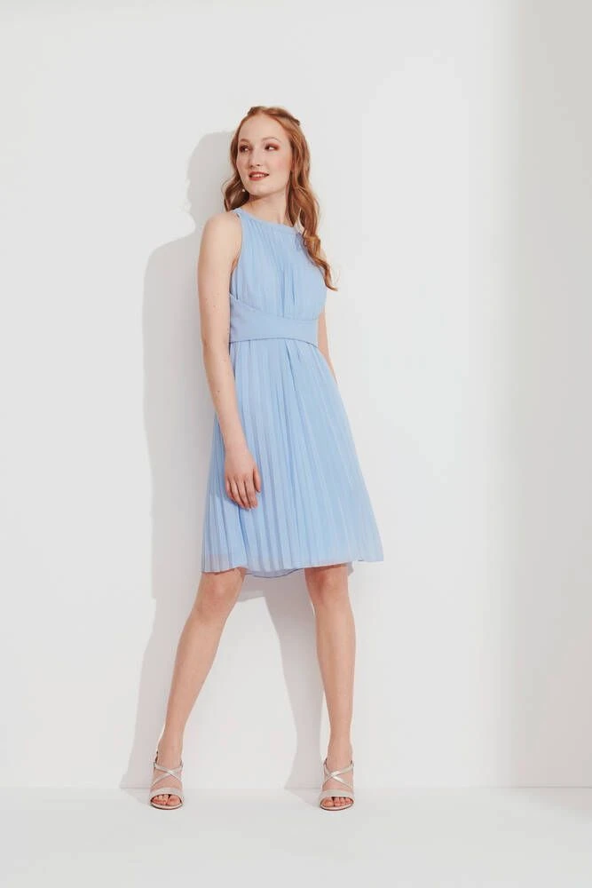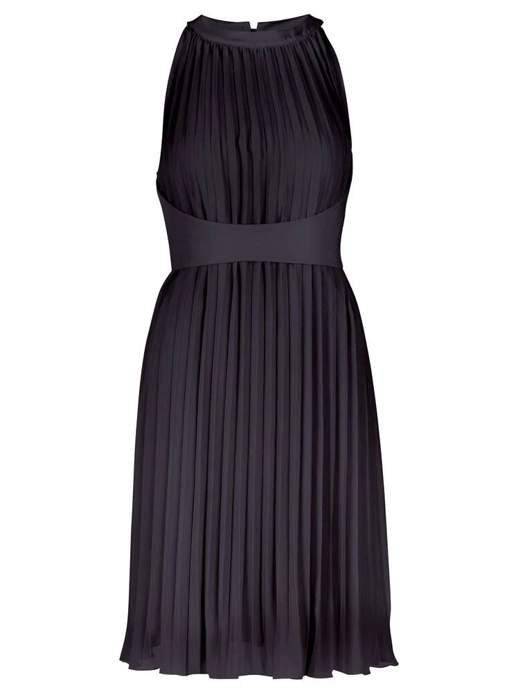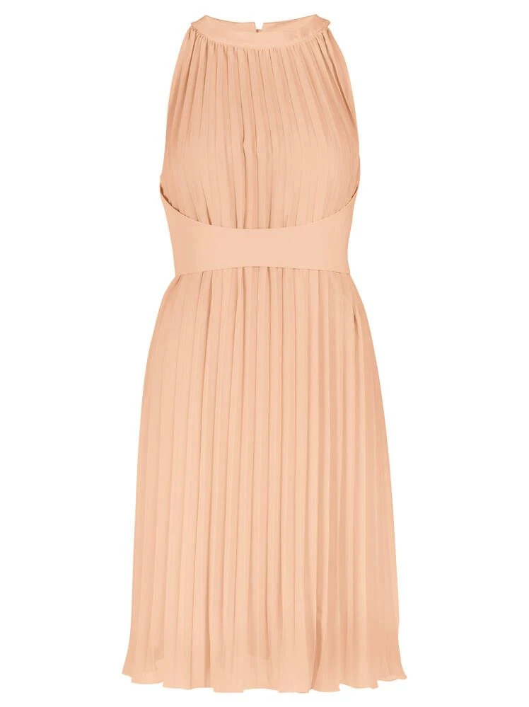 Naisten lyhyt, pliseerattu mekko. Mekossa on vyötäröllä leveä panta.