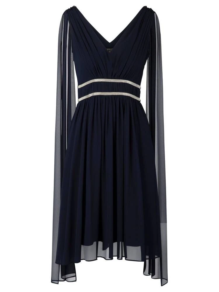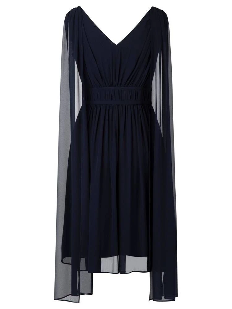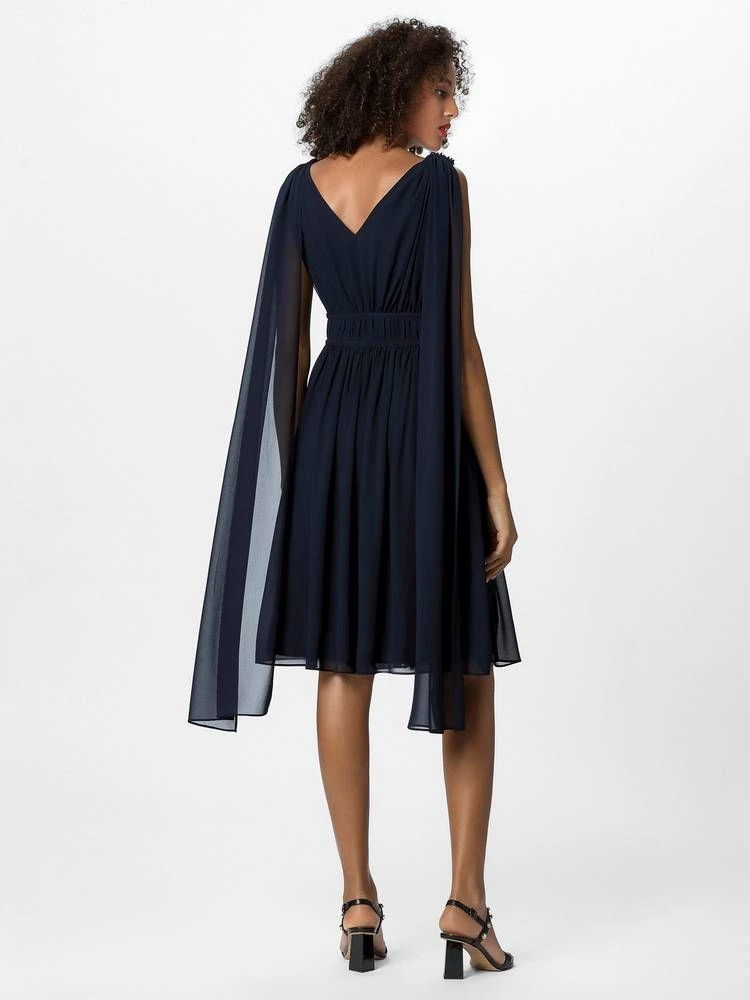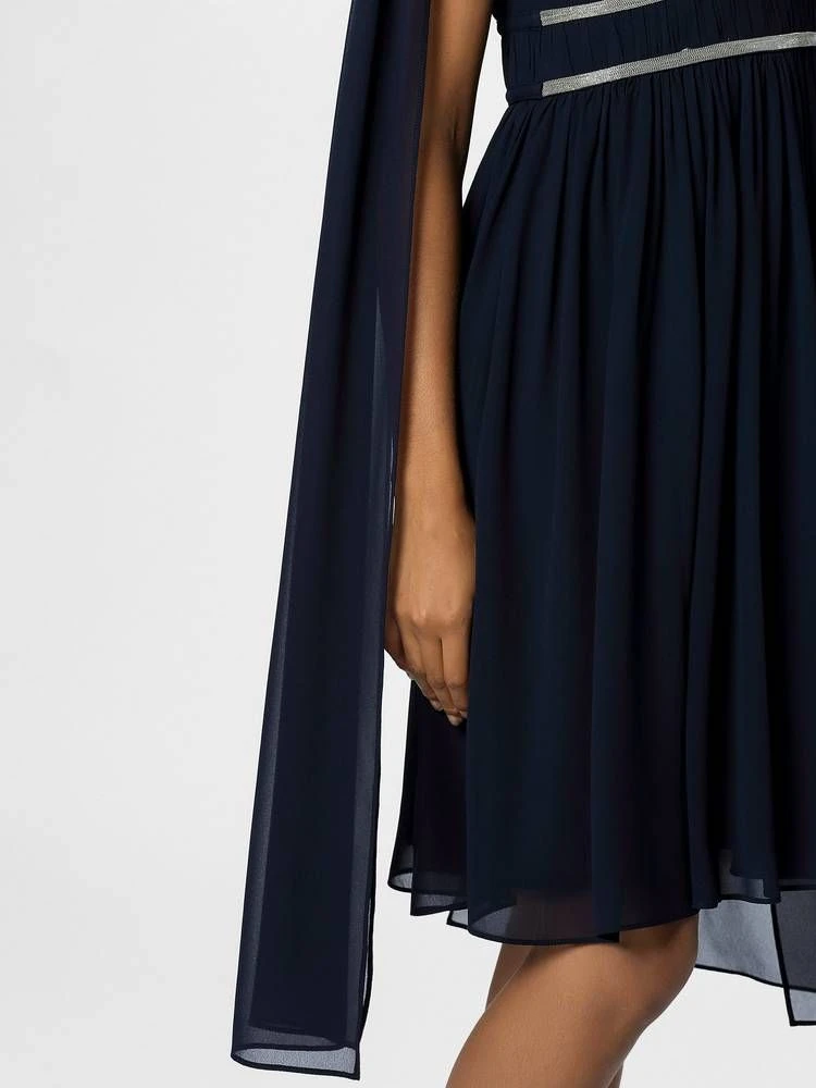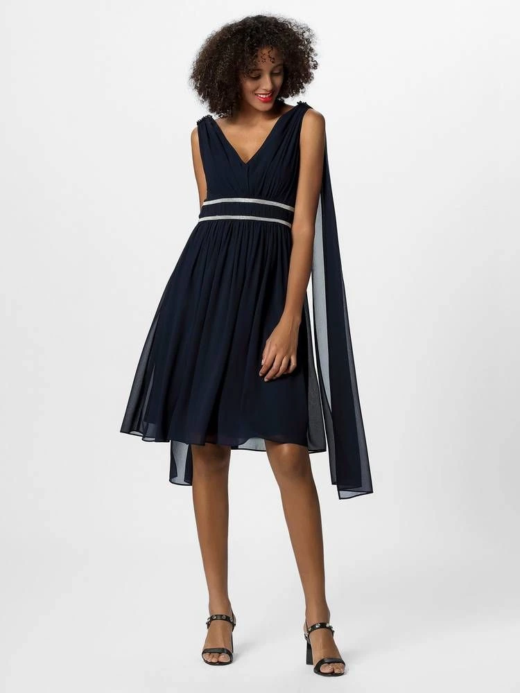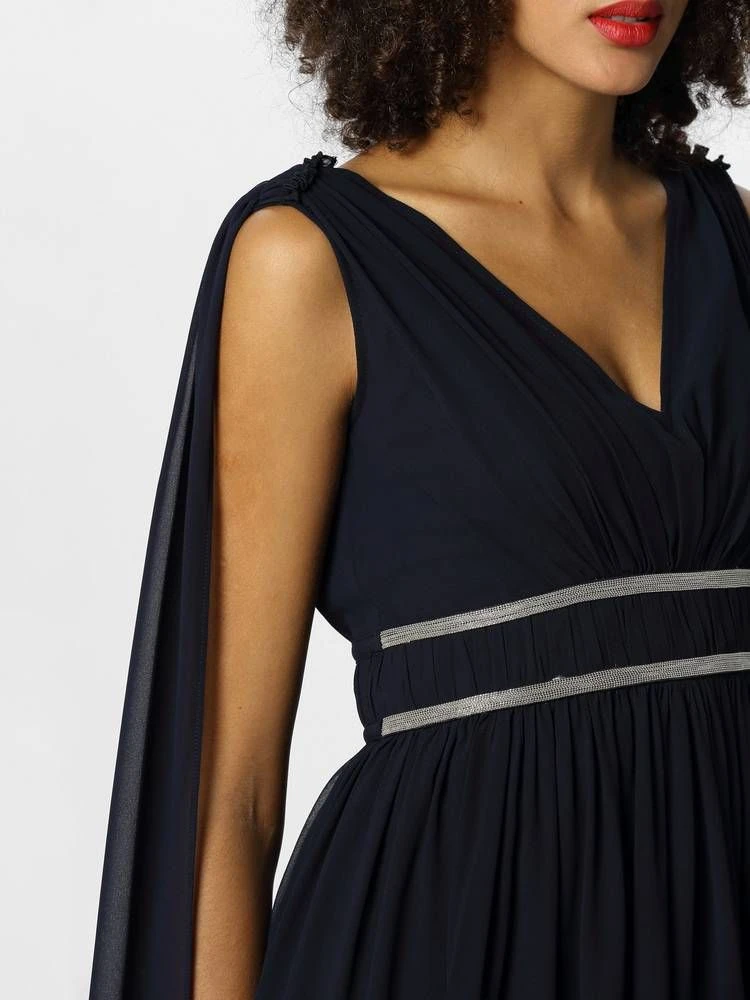 Kaunis yönsininen sifonkimekko syvällä V-pääntiellä ja muotoa antavalla, osittain hopeisella vyötärönauhalla. Näyttävät sifonkihuivit on kiinnitetty mekon olkapäille.