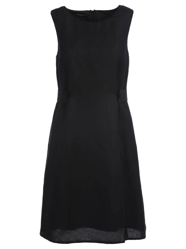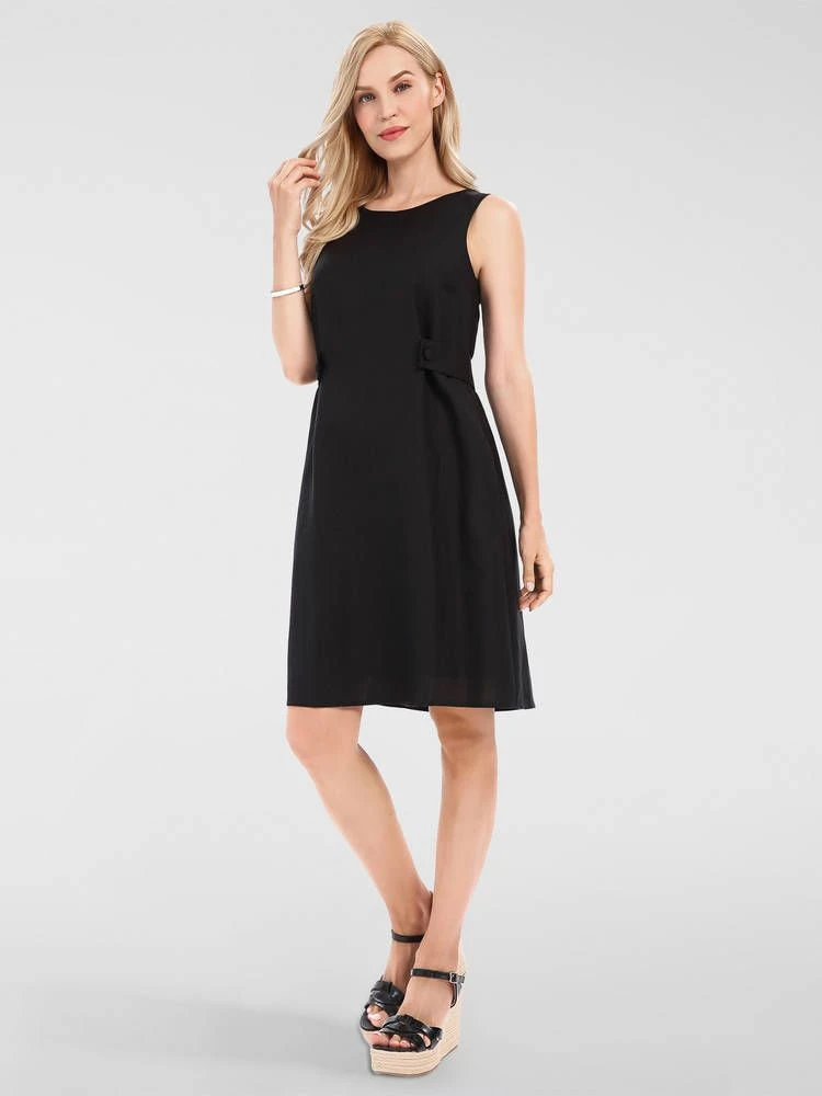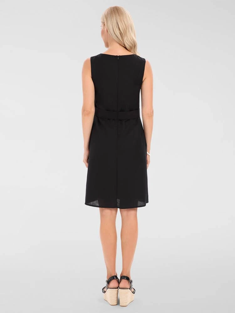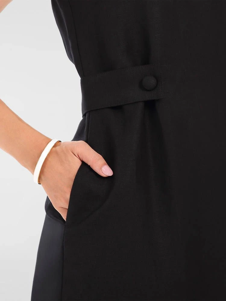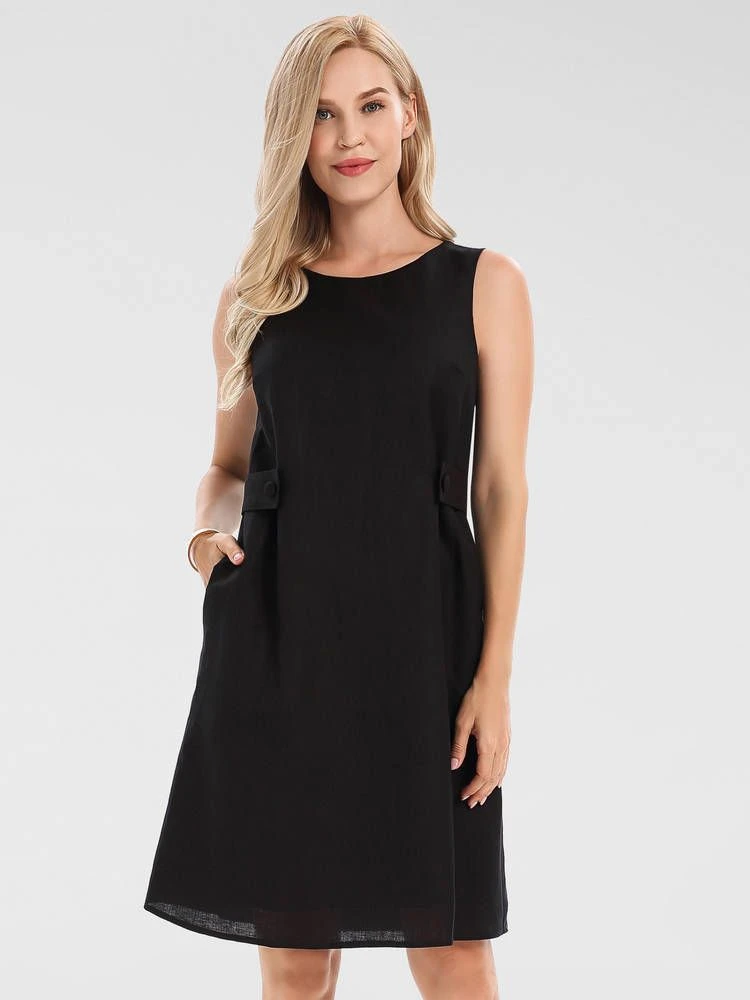 Monikäyttöinen pellavasekoitemekko huomaamattomilla etutaskuilla. Vyötäröllä on tyylikkäät koristenapit. Pukemista helpottaa selkäpuolen piilovetoketju.