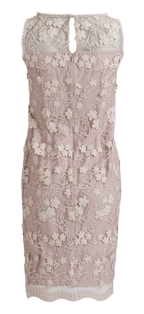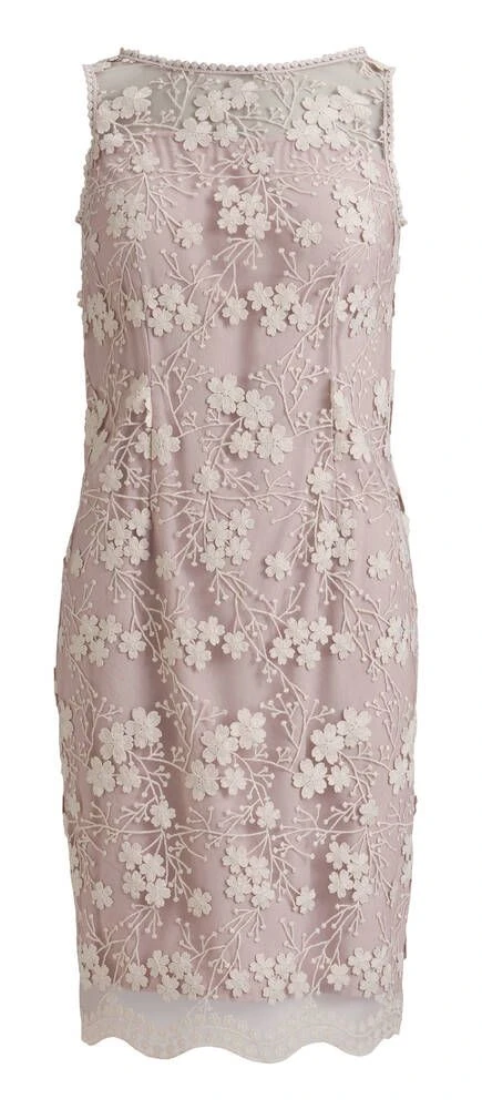 Hihaton kotelomekkotyylinen pitsimekko, jonka selkäpuolella on sekä nappi- että vetoketjukiinnitys. Vuorikangas on sävyltään aavistuksen tummempi kuin kukkakuvioitu pitsipäällinen.