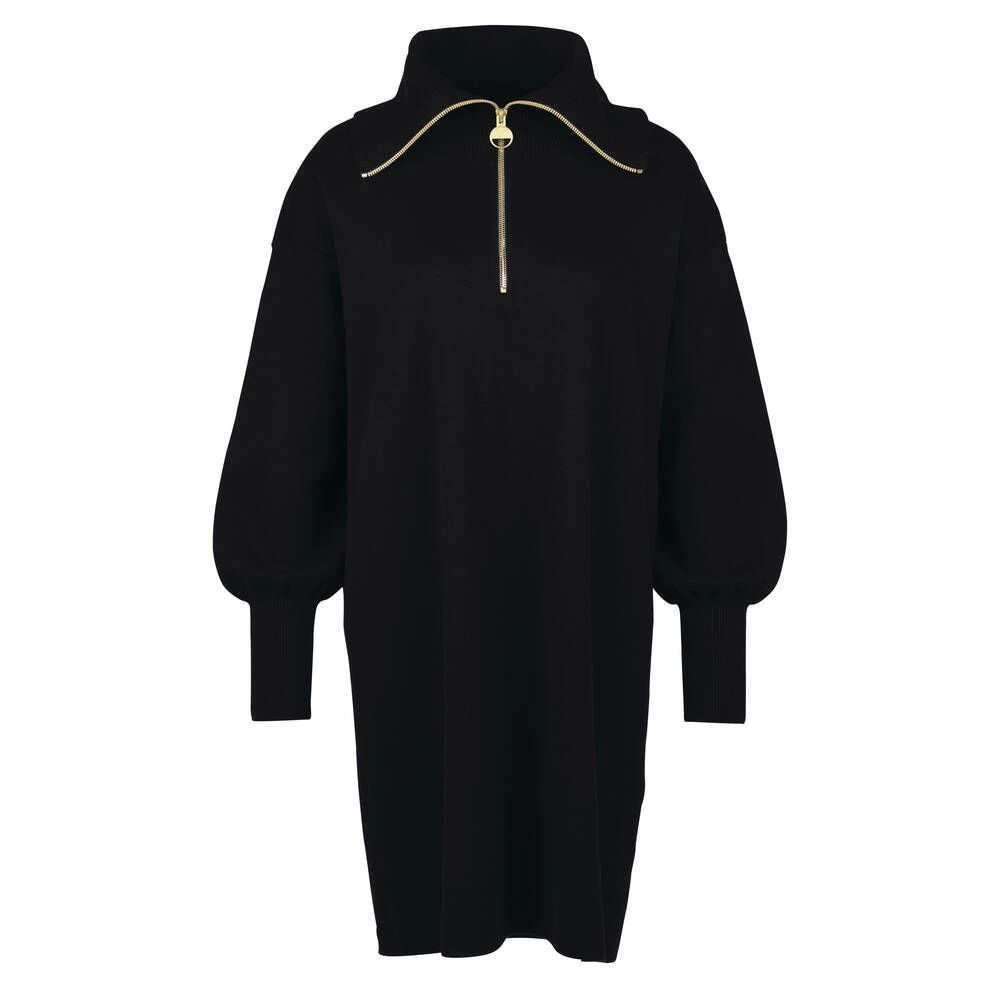 Naisten neulemekko korkealla kauluksella, jossa on kultainen vetoketju.