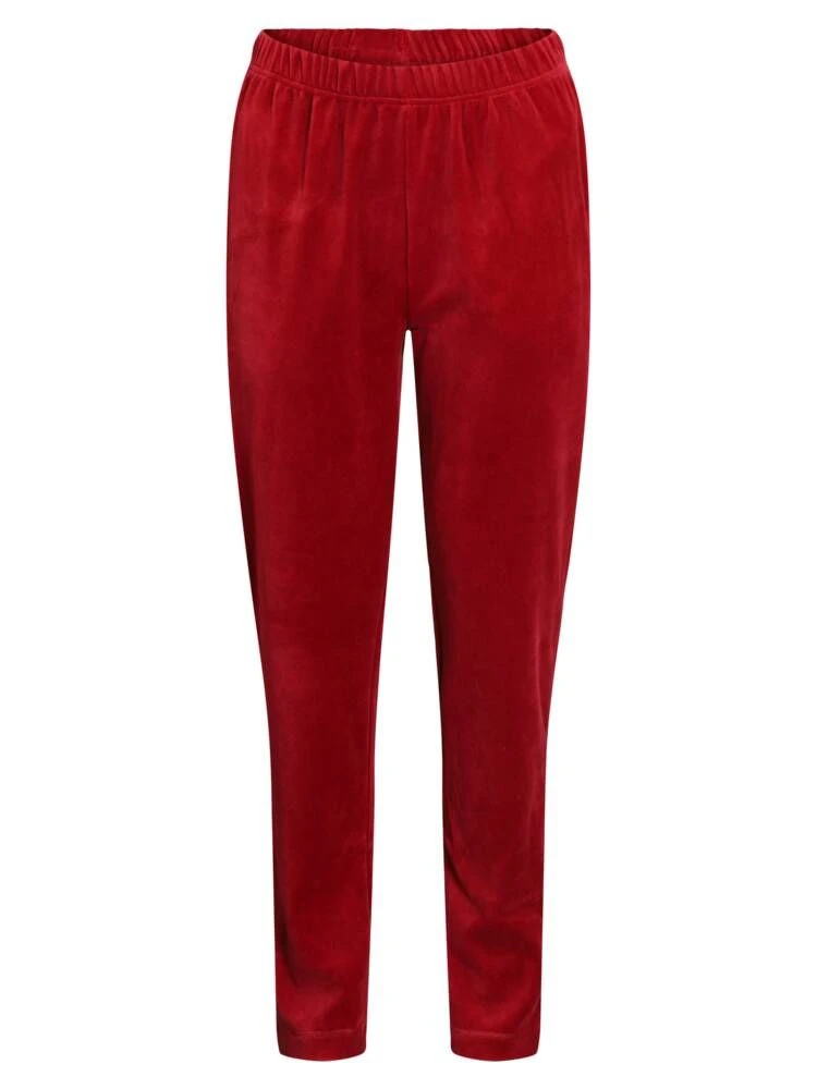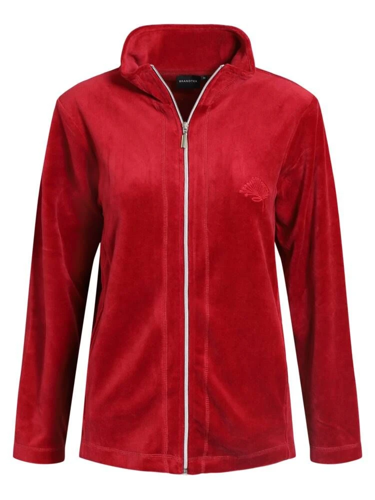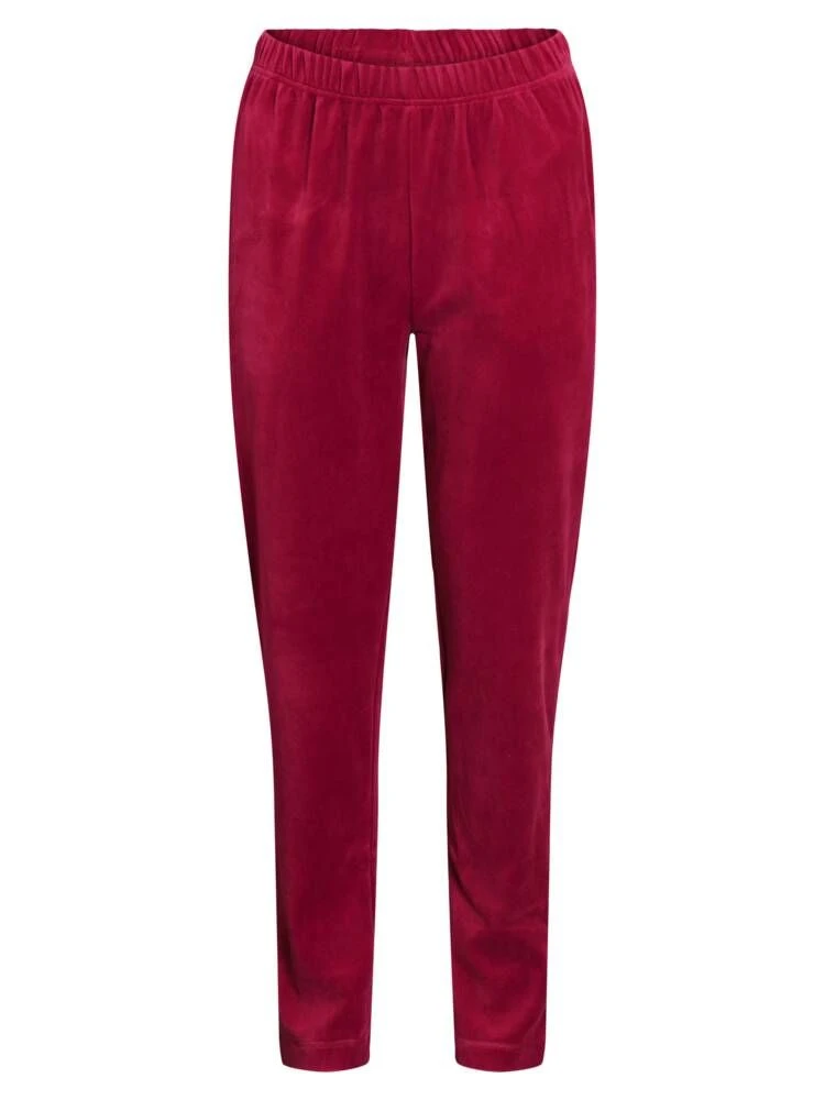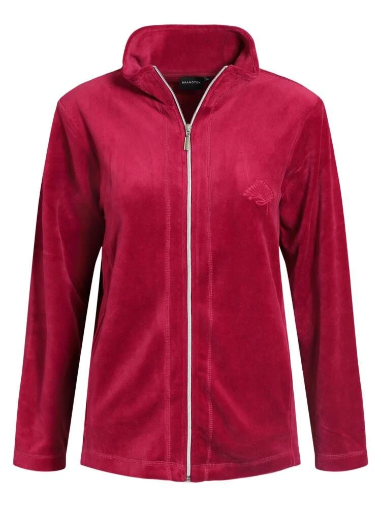 Yksivärinen velour-oloasu vetoketjullisella yläosalla ja brodeeratulla rintakoristeella. Housujen joustava kuminauhavyötärö lisää käyttömukavuutta.