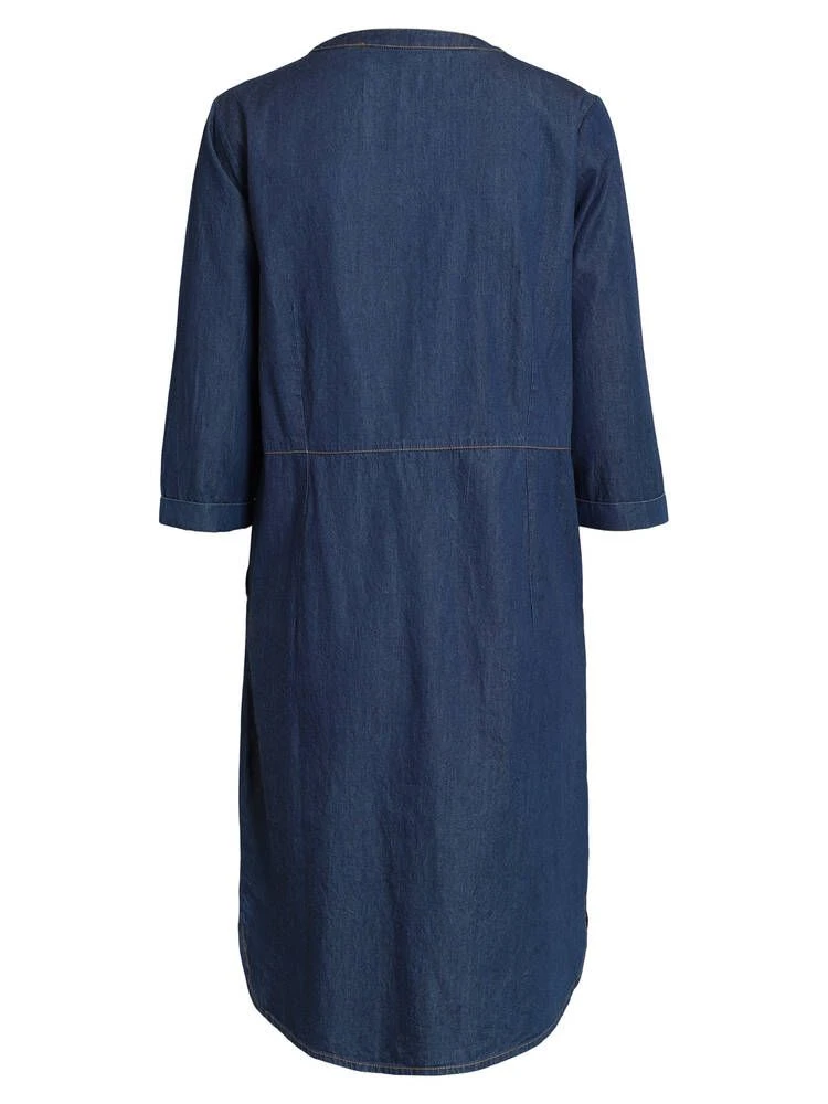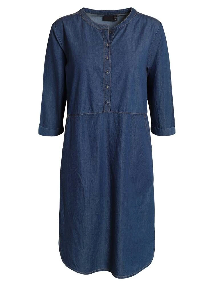 Ajaton farkkutyylinen mekko vajaamittaisilla hihoilla. Pääntiellä on tyylikäs nappilista ja vyötäröllä koristesauma.