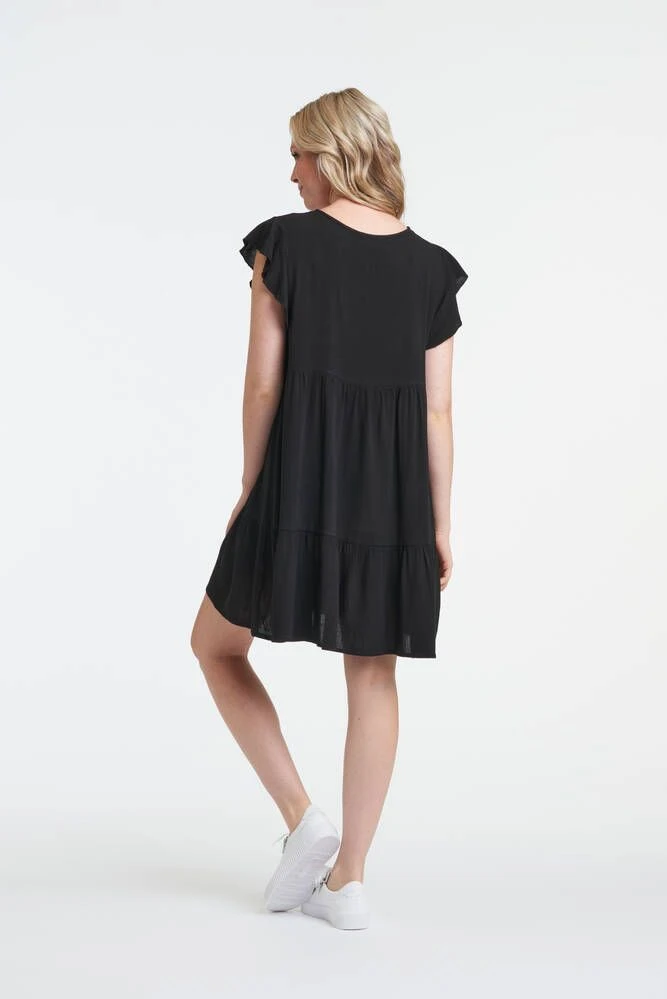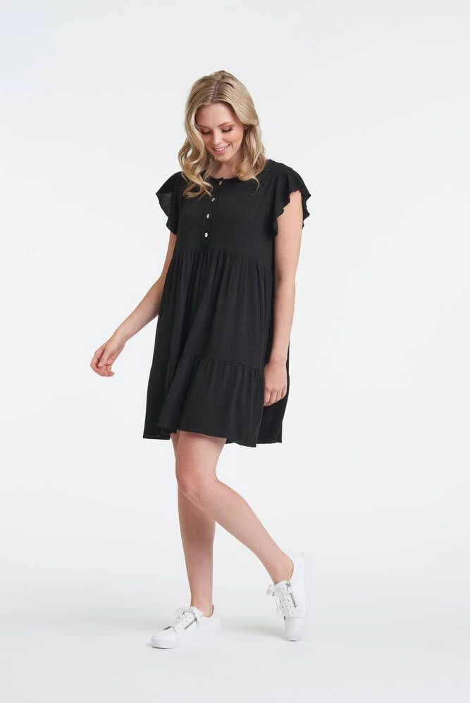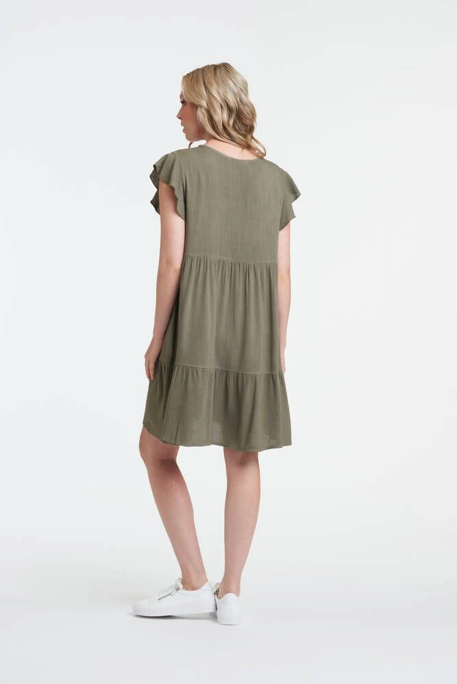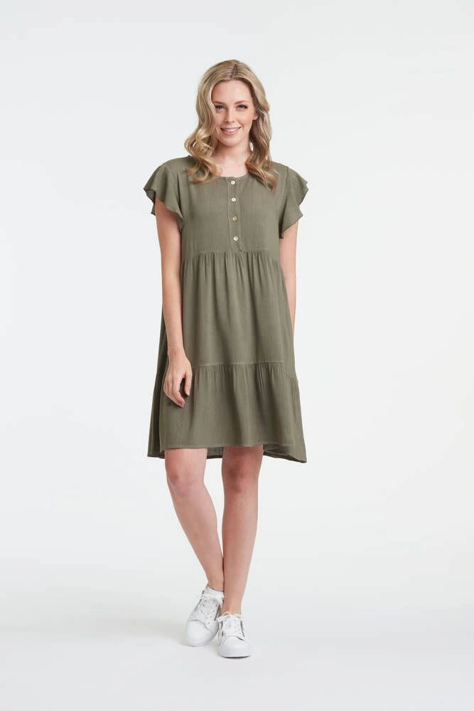 Naisten ihanan kevyt yksivärinen mekko lyhyillä hihoilla. Pääntieltä lähtee lyhyt nappirivi. Väljän mekon helmassa on rypytetyt saumat.