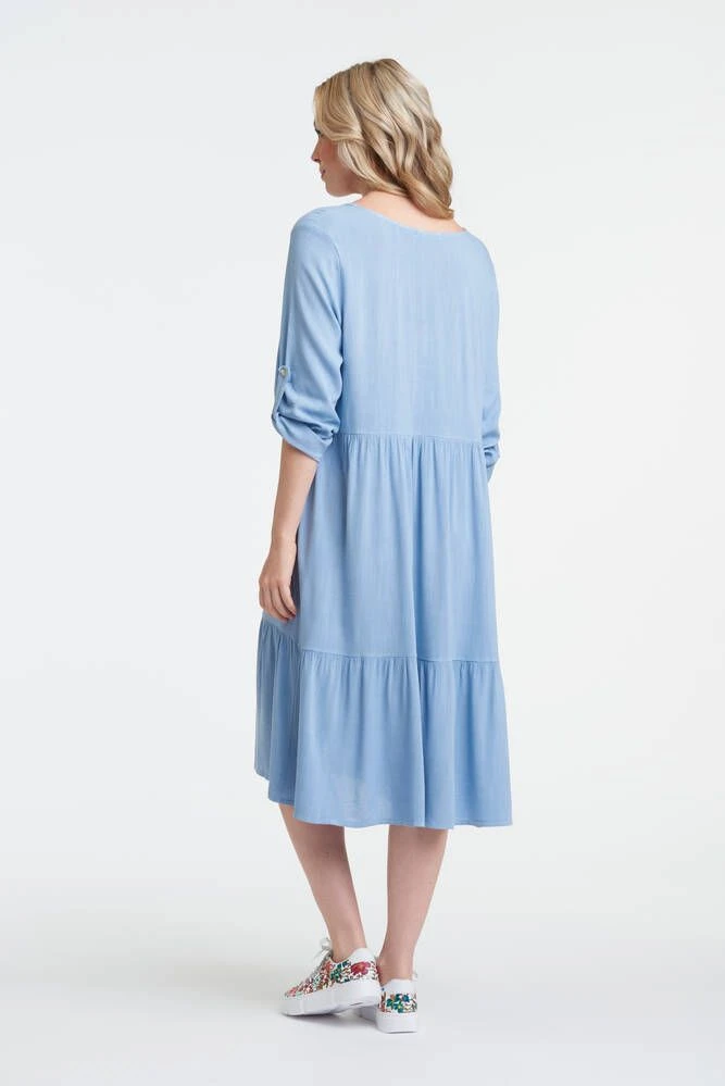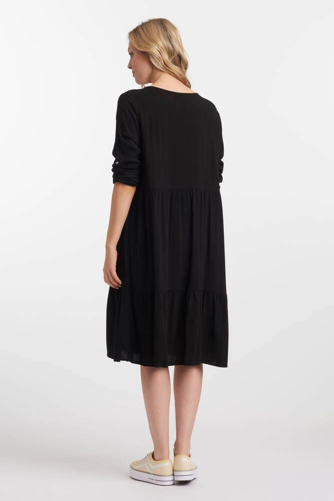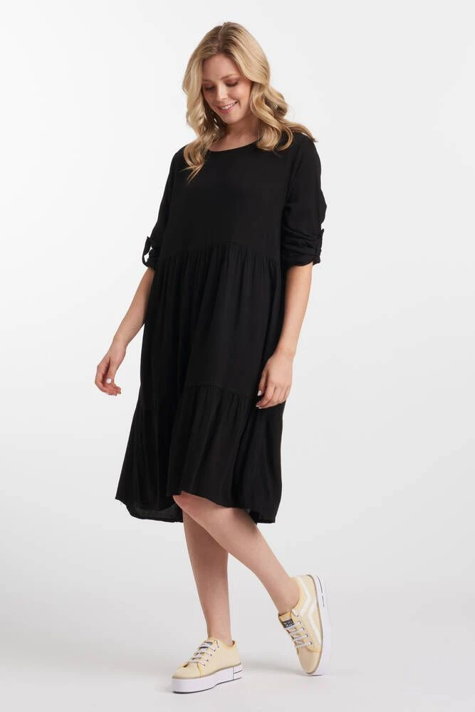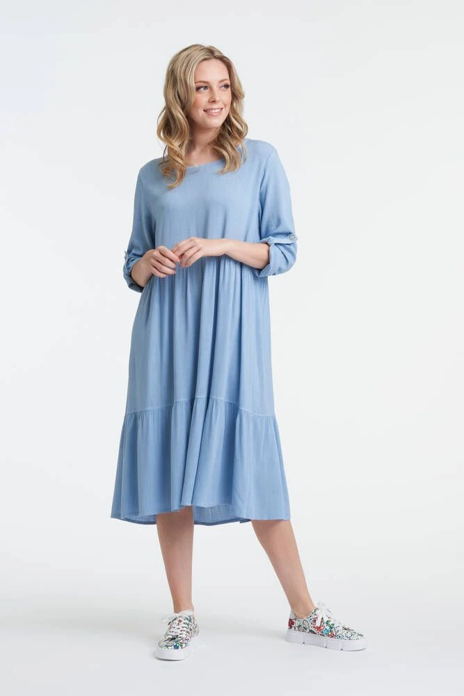 Naisten väljä yksivärinen mekko käärittävillä hihoilla. Vyötäröllä ja helmassa on rypytetyt saumat. Pehmeä materiaali lisää käyttömukavuutta.