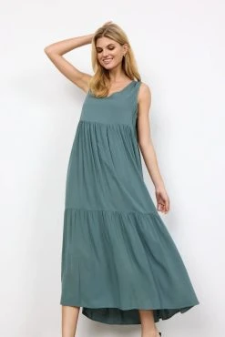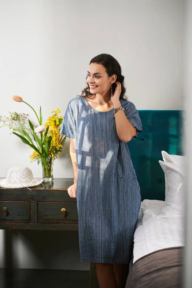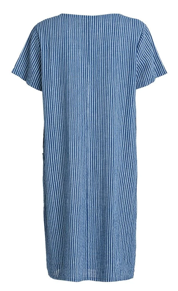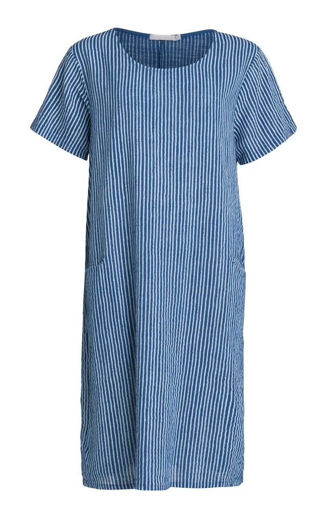 Naisten väljänmallinen puuvillamekko lyhyillä hihoilla ja tyylikkäällä pystyraitakuosilla. Mekon etupuolella on pienet avotaskut.