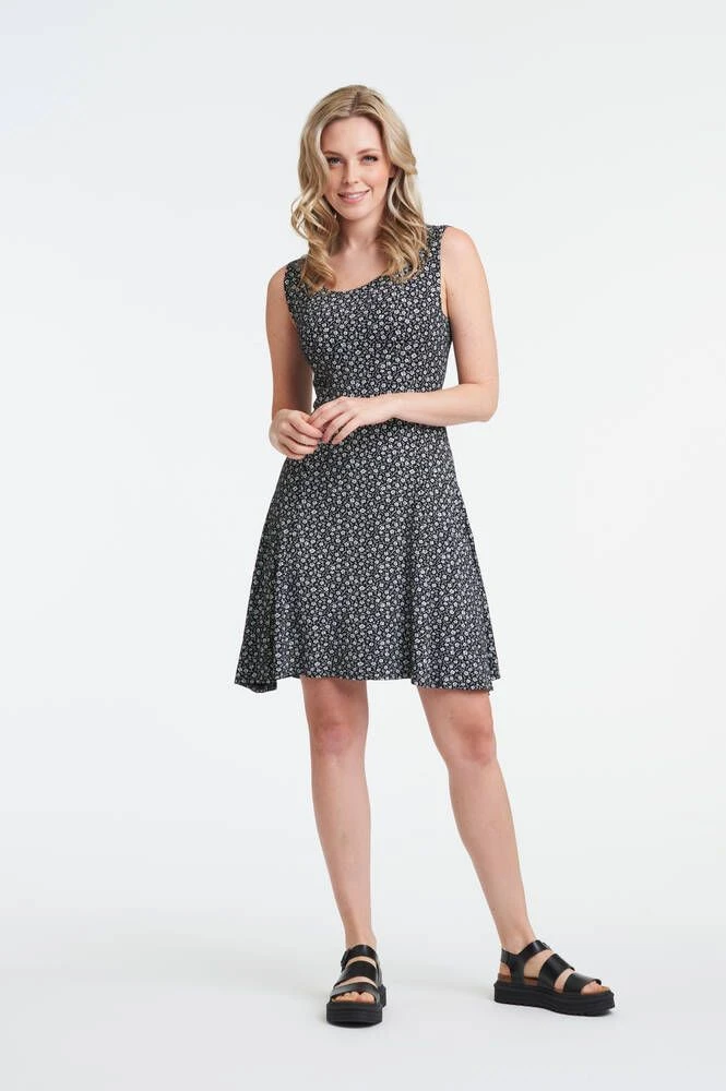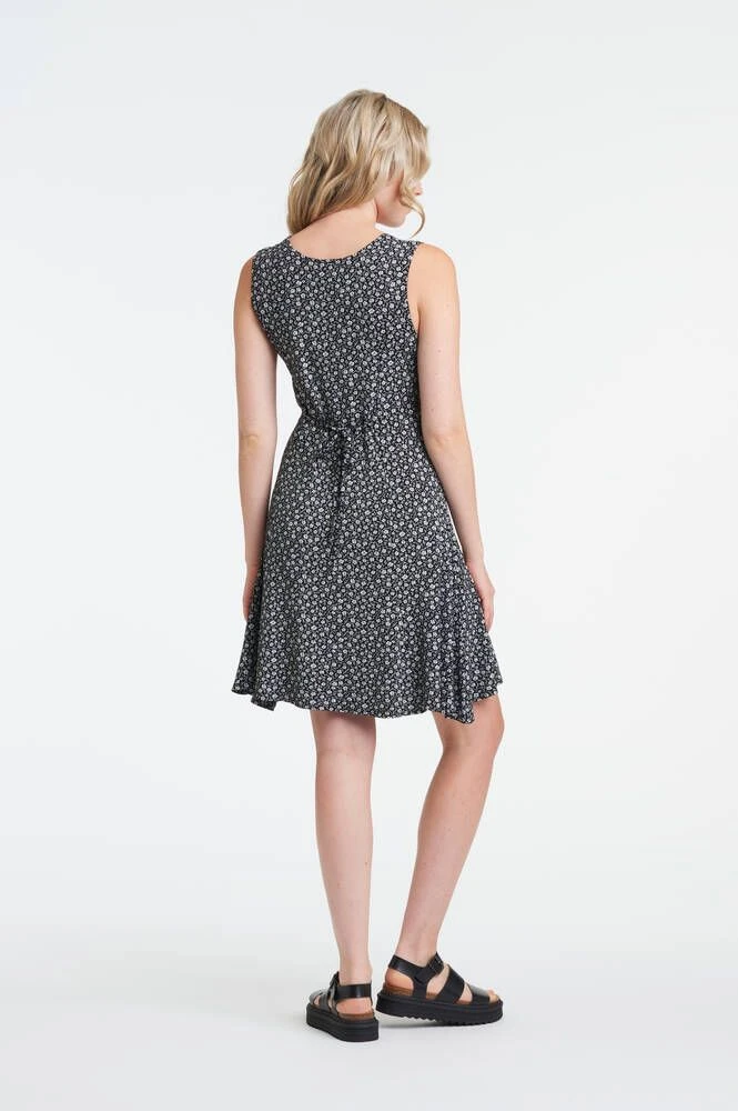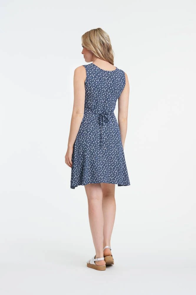 Naisten hihaton trikoomekko pienellä kukkakuosilla ja ihanalla kellohelmalla.