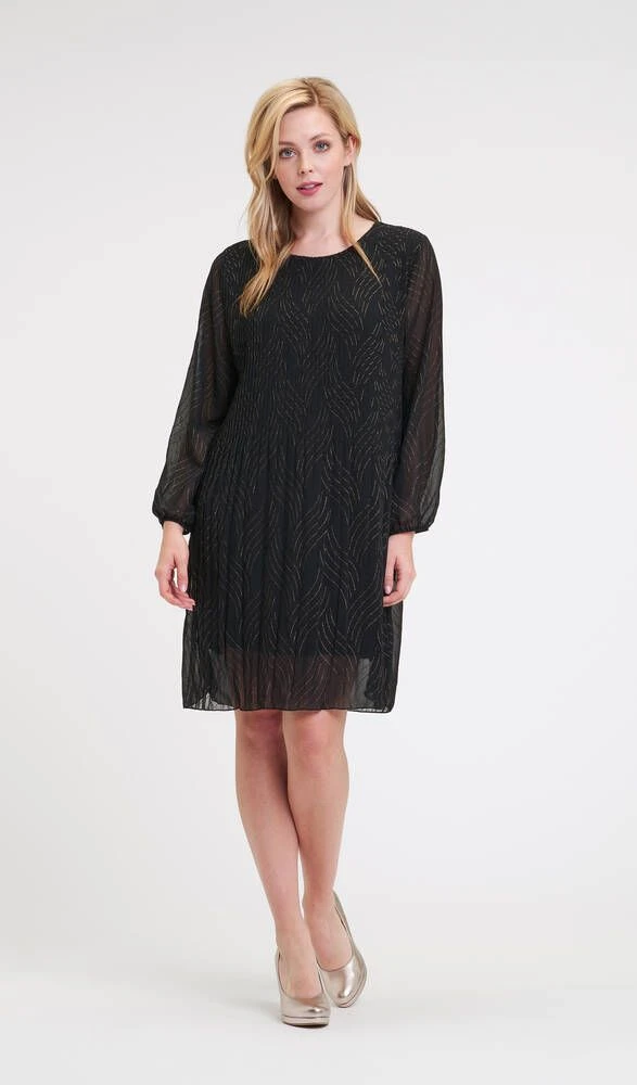 Naisten pliseerattu sifonkimekko kultaglitterillä. Mekossa on pitkät hihat, joiden suissa on kumpparit.