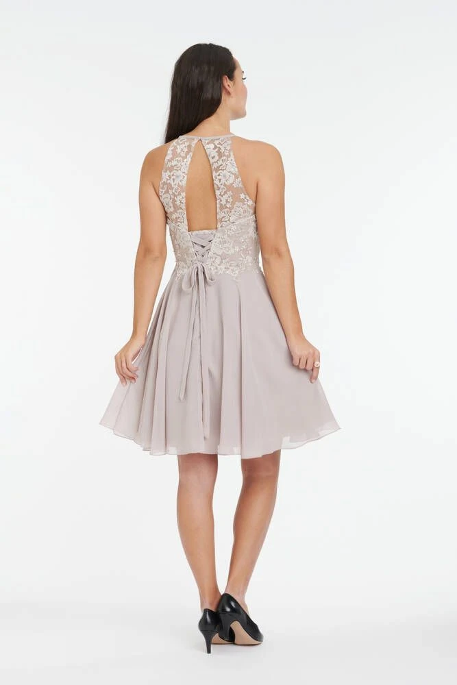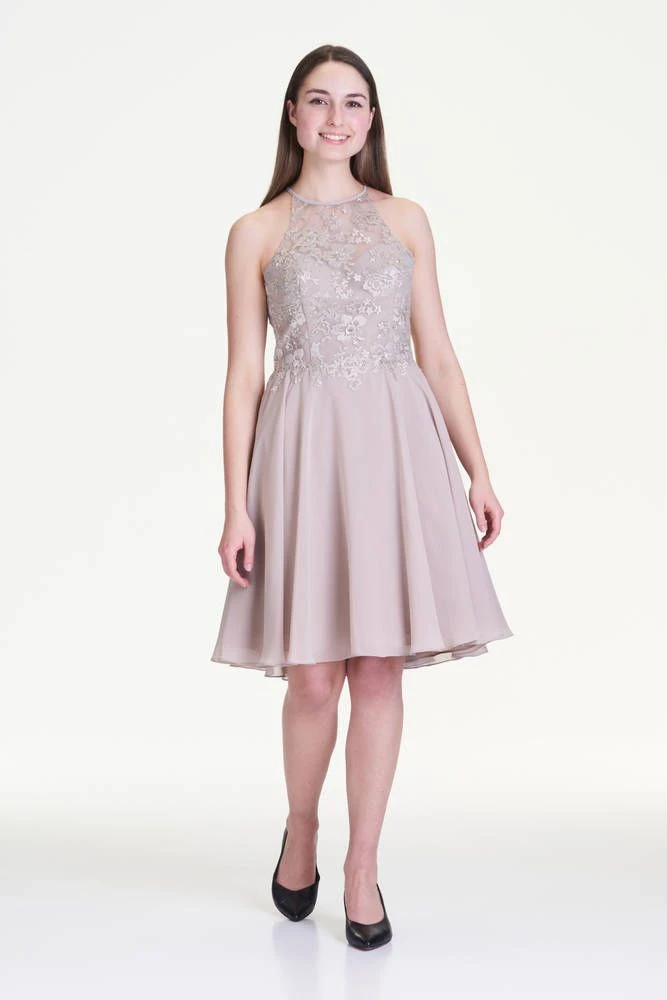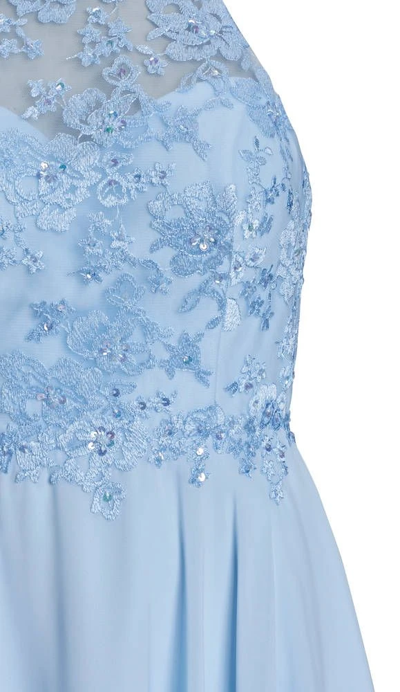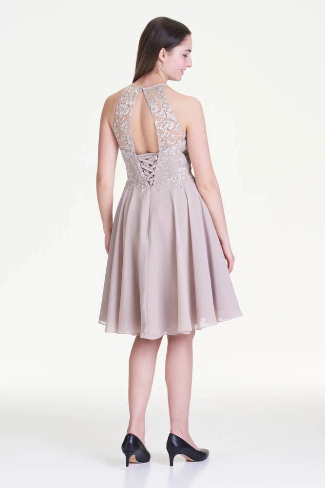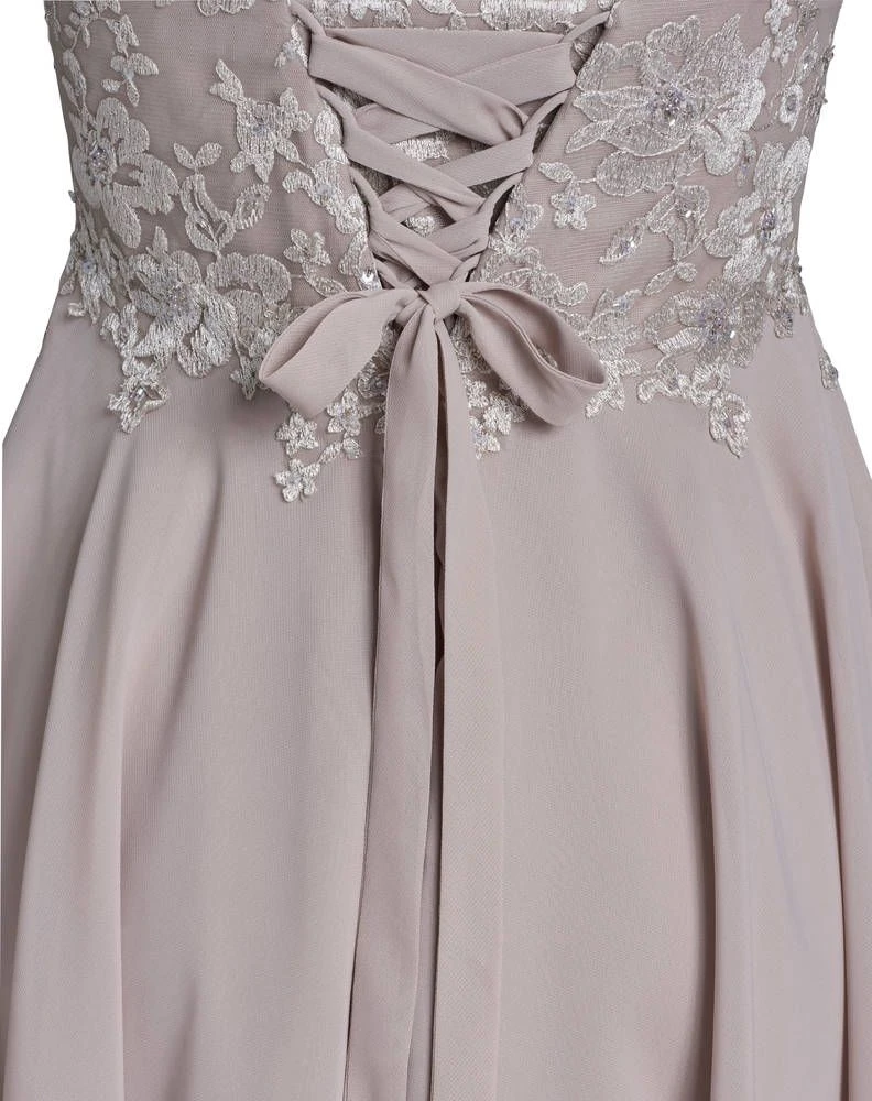 Kaunis sifonkihelmainen mekko pitsiyläosalla. Mekossa on siro yläosa, avonainen selkäpuoli ja juhlava nyöritys jolla säädät helposti mekon istuvuutta.
