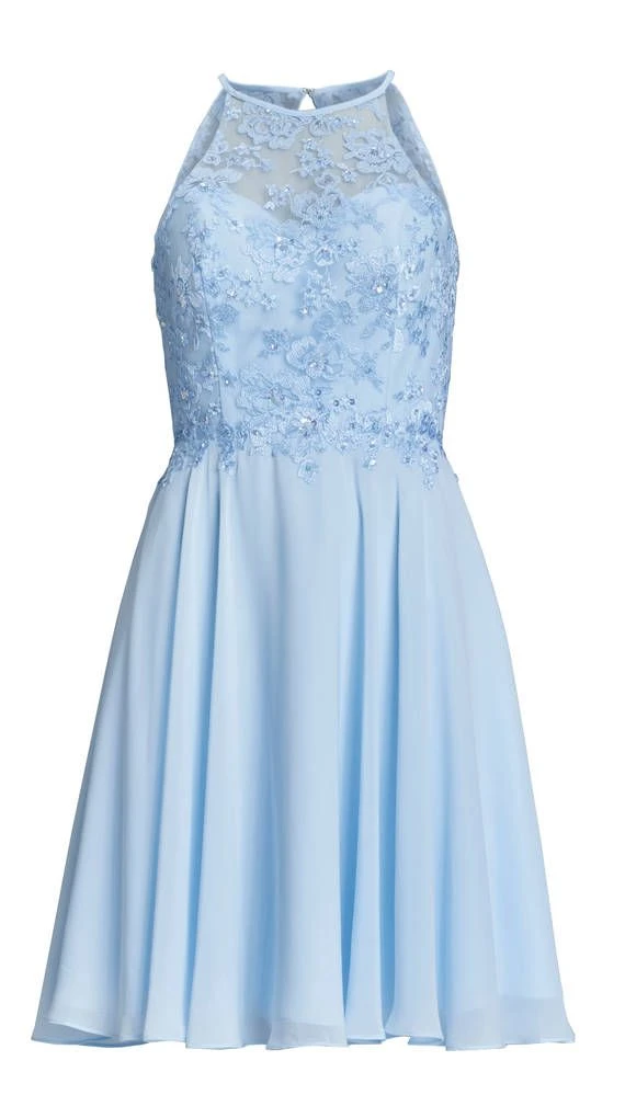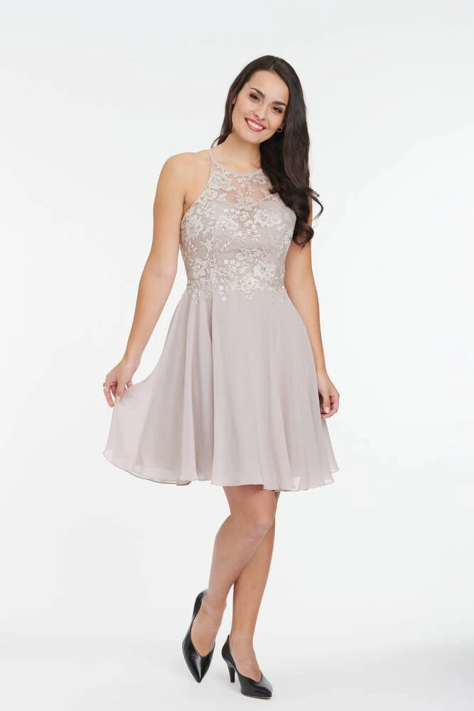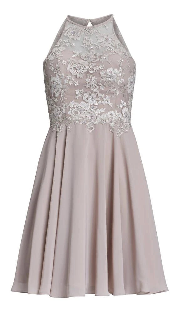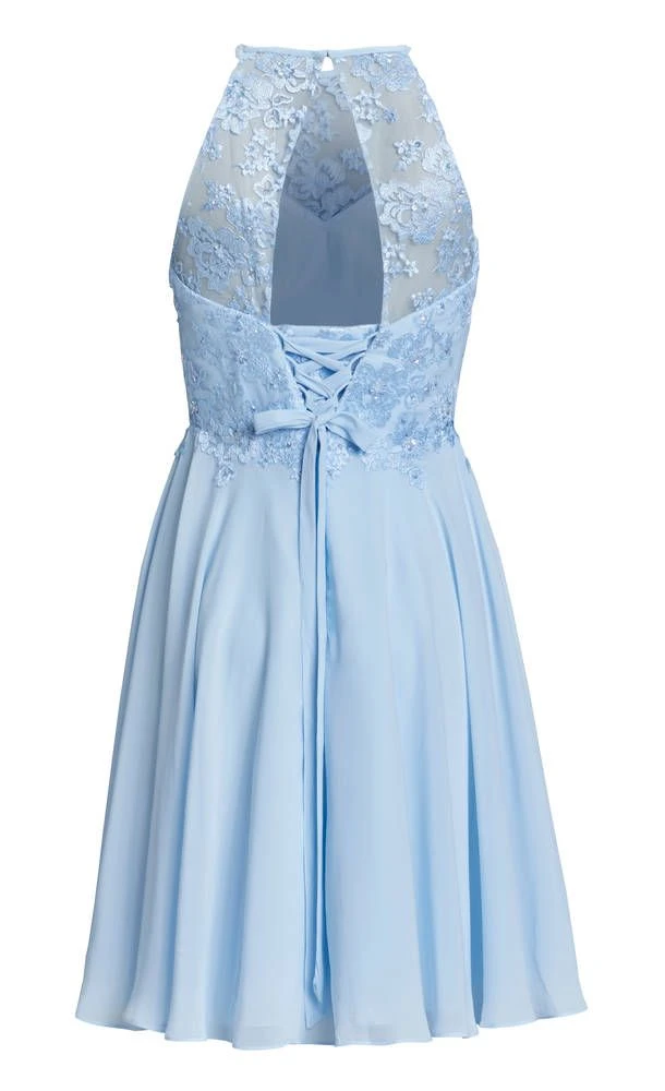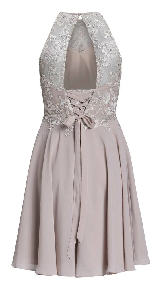 Kaunis sifonkihelmainen mekko pitsiyläosalla. Mekossa on siro yläosa, avonainen selkäpuoli ja juhlava nyöritys jolla säädät helposti mekon istuvuutta.