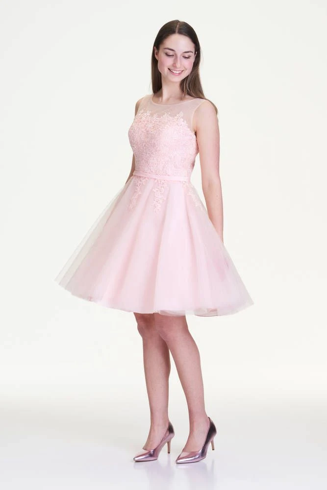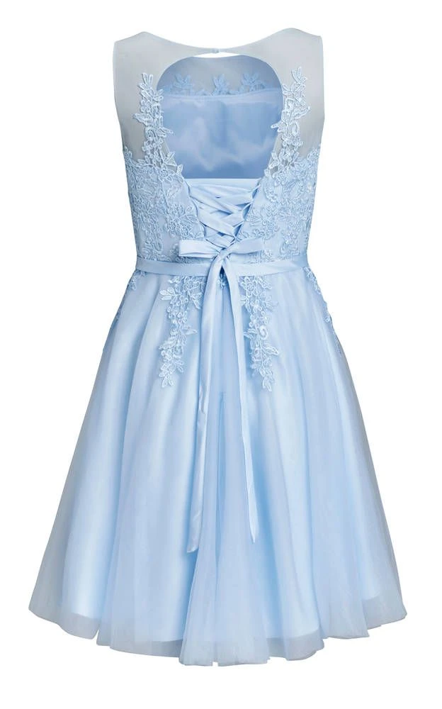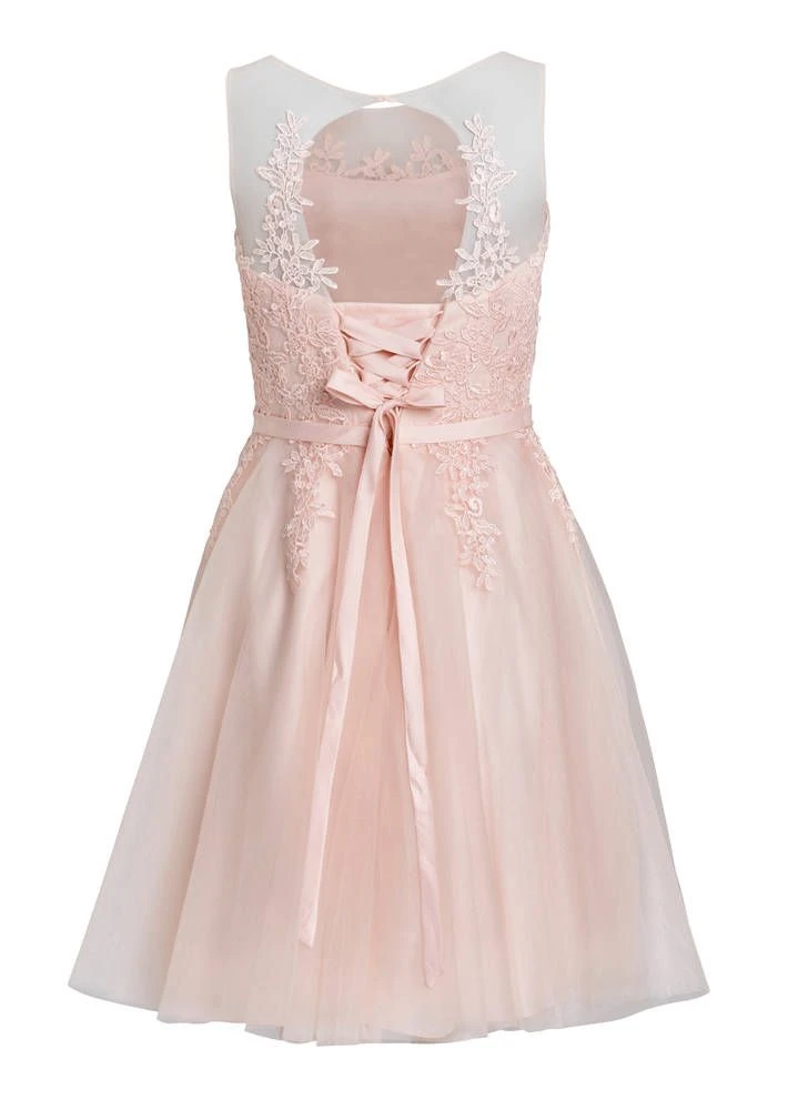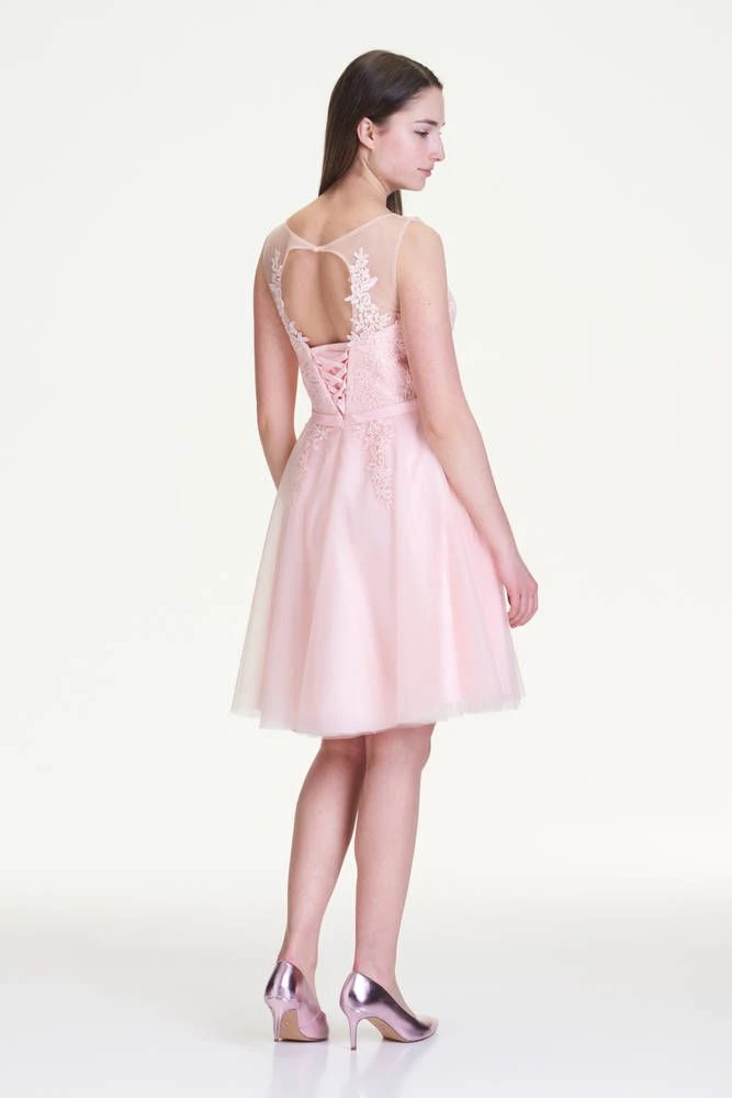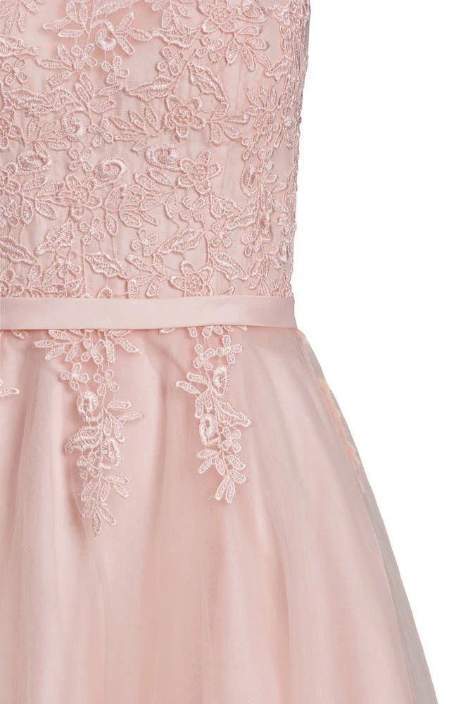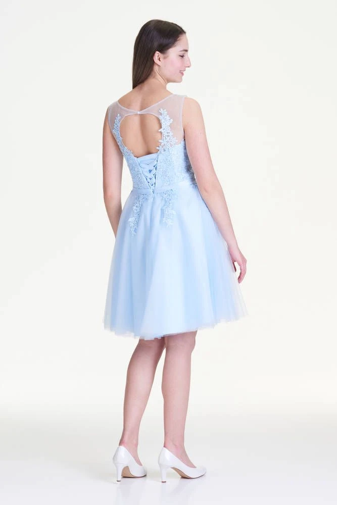 Kaunis tyllimekko, jossa on kirjailtu yläosa. Avonainen selkäosa ja nyörit kruunaavat juhlavan kokonaisuuden. Nyörien avulla säädät helposti mekon istuvuutta.