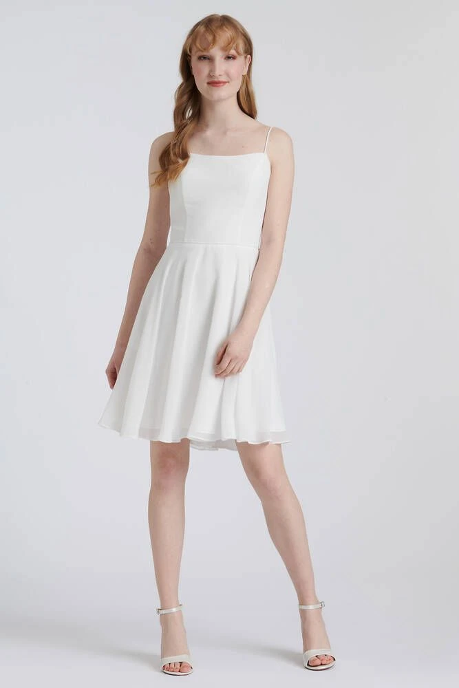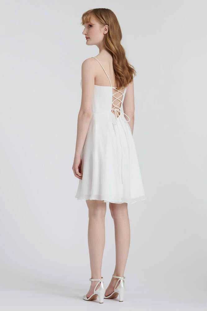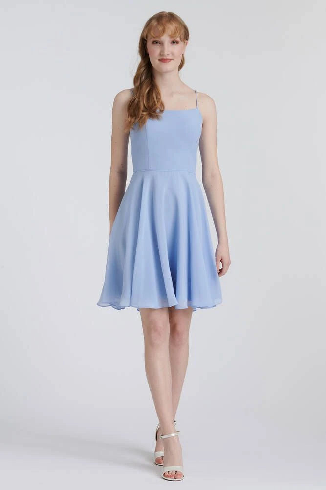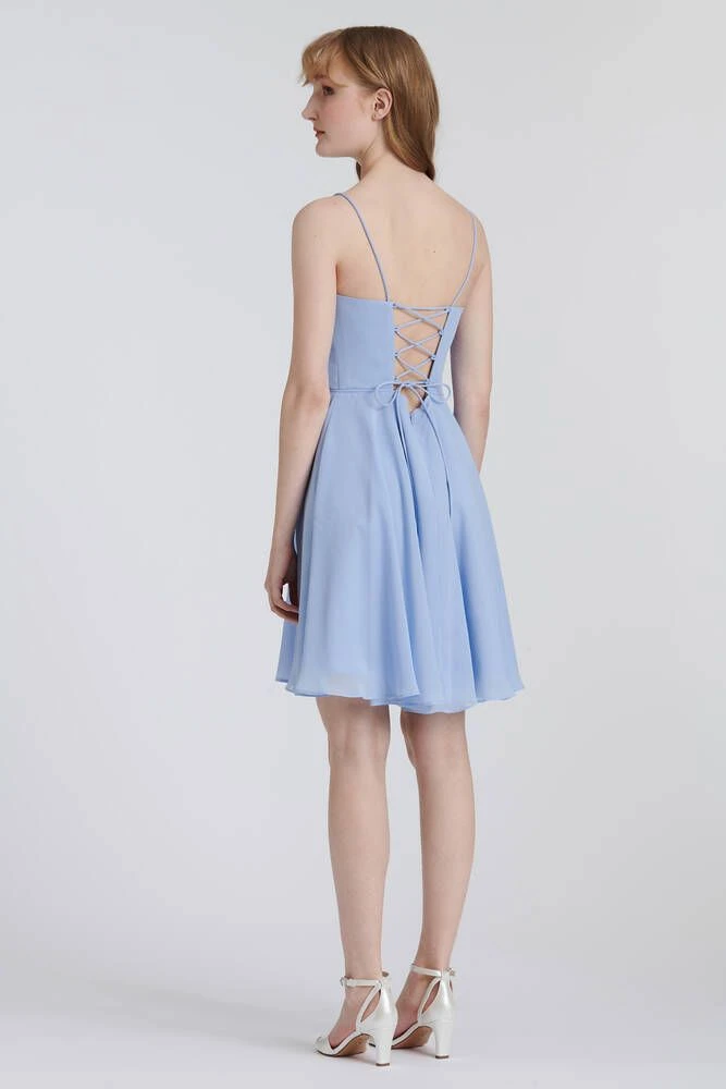 Kaunis sifonkinen juhlamekko. Mekossa on kapeat olkaimet sekä avoin nyöritetty selkä.