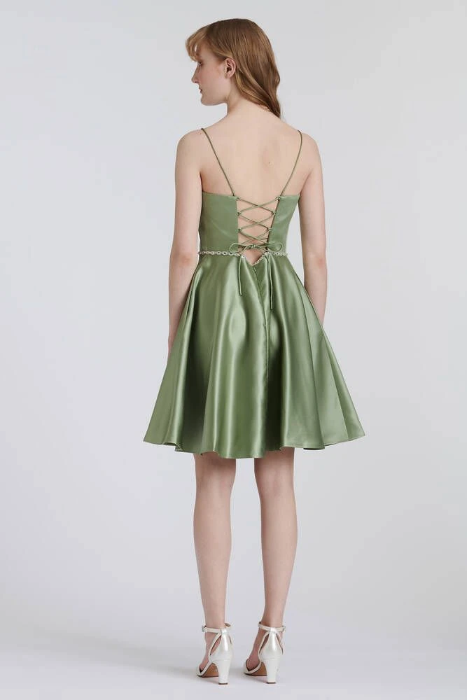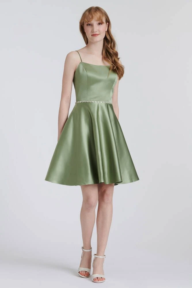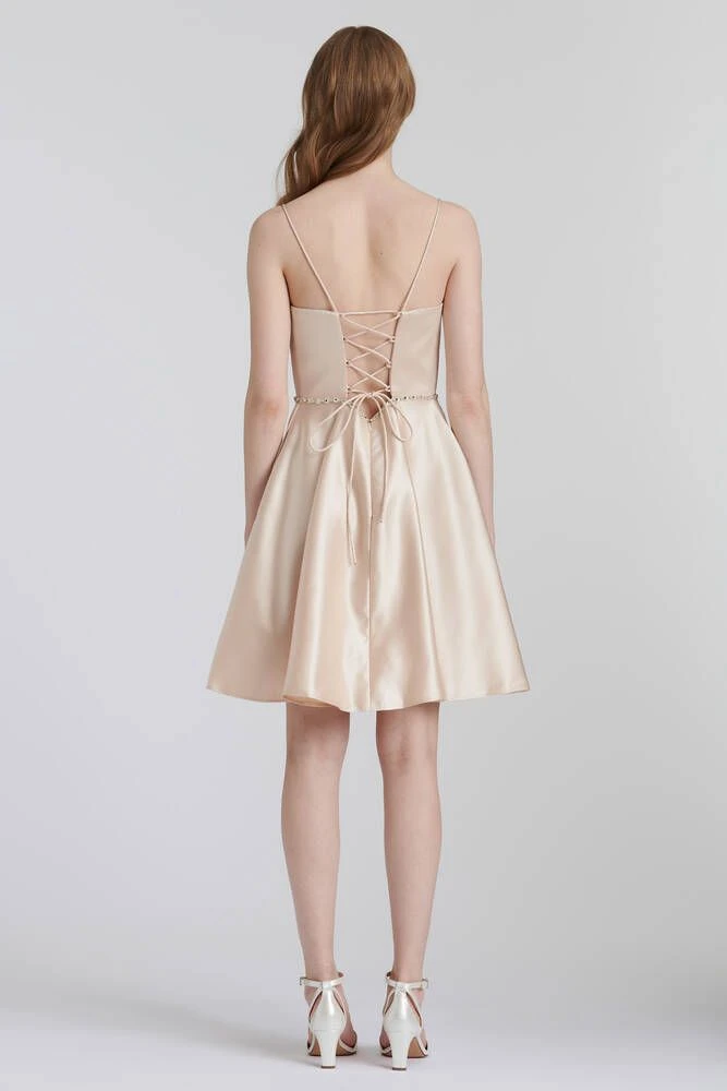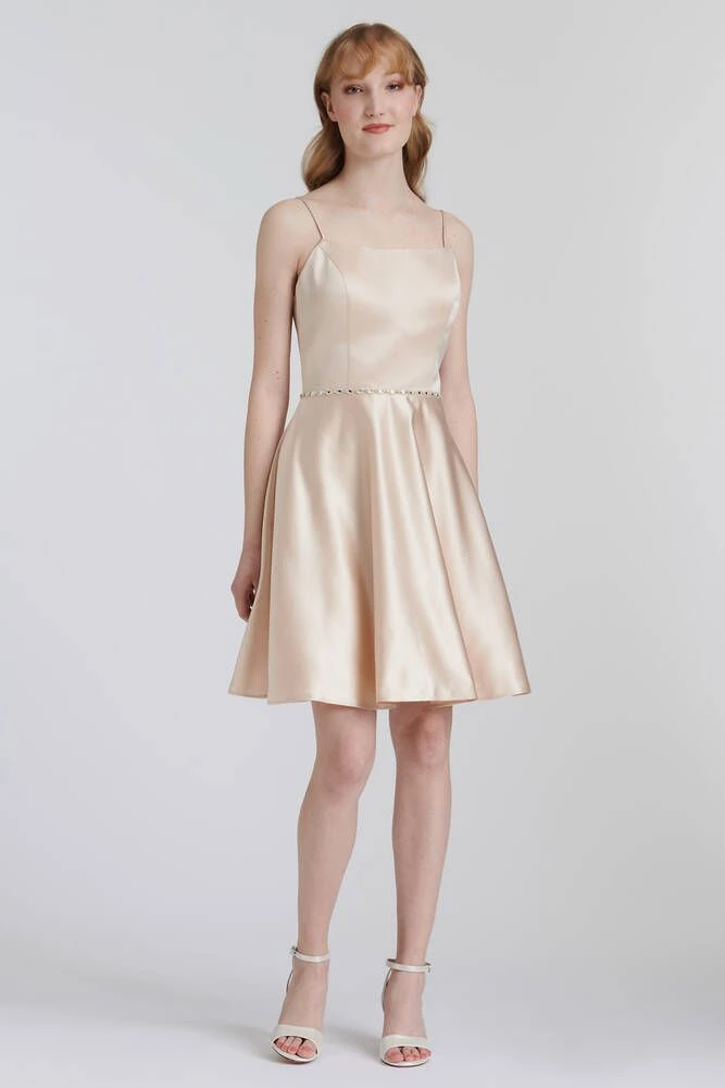 Upea satiininen mekko kimaltelevalla tyllillä. Puvun vyötäröllä on kauniita koristekiviä. Muuntautuva nyöritysosa selässä antaa säätövaraa joka koolle.