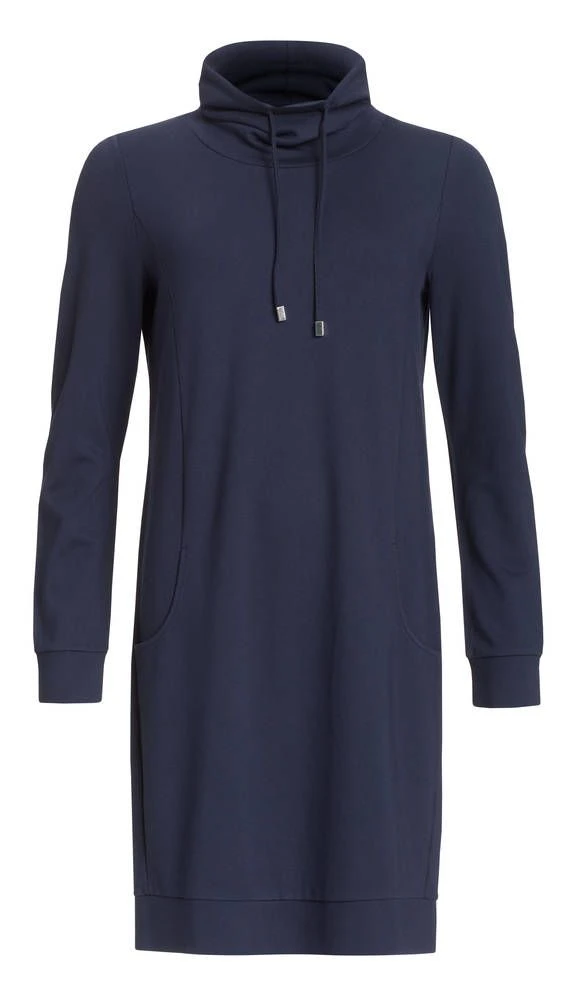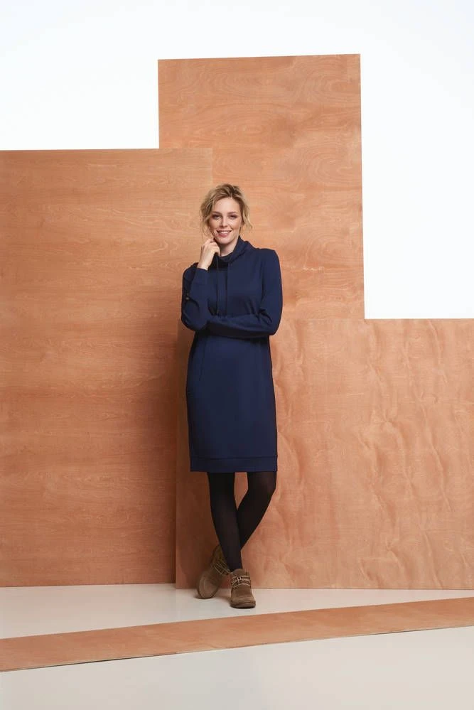 Rento ja väljä poolokauluksinen mekko pitkillä hihoilla ja etutaskuilla. Kauluksessa on kätevät kiristysnauhat.