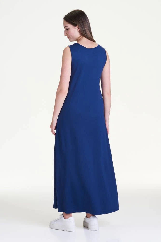 Hihaton A-linjainen mekko, jonka vyötäröllä on kätevät piilotaskut. Pohjemittaisessa mekossa on pyöreä pääntie.
