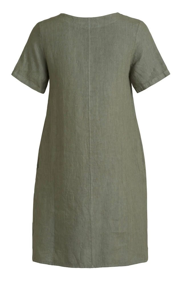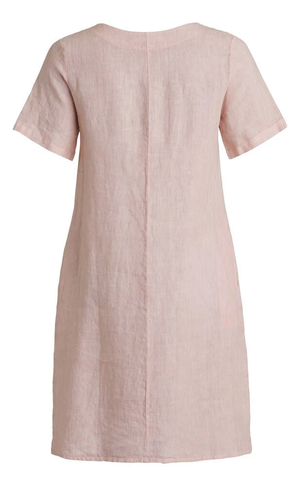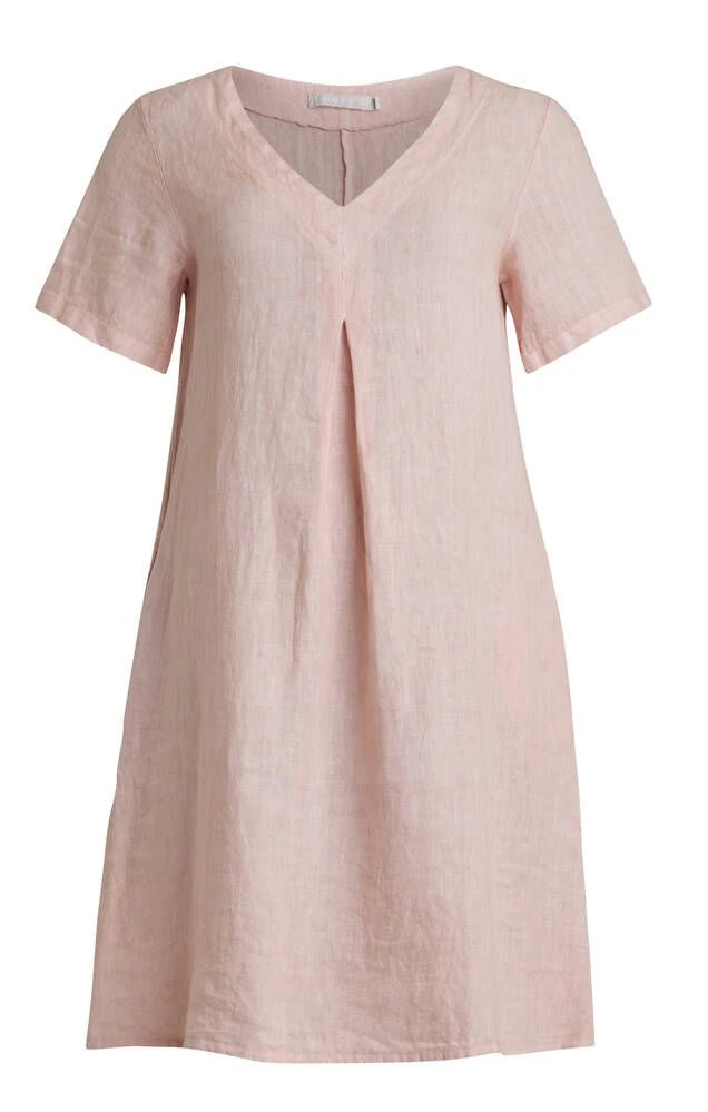 Naisten yksivärinen pellavamekko V-pääntiellä ja lyhyillä hihoilla. Edessä on kauniit laskokset ja sivusamoissa huomaamattomat avotaskut.