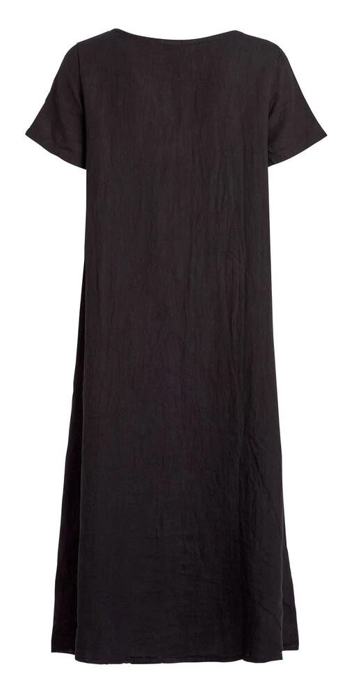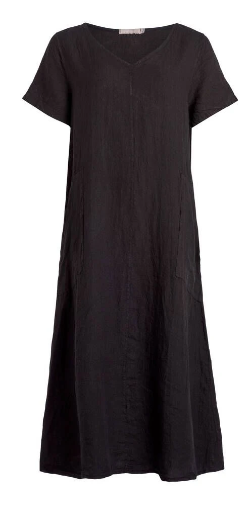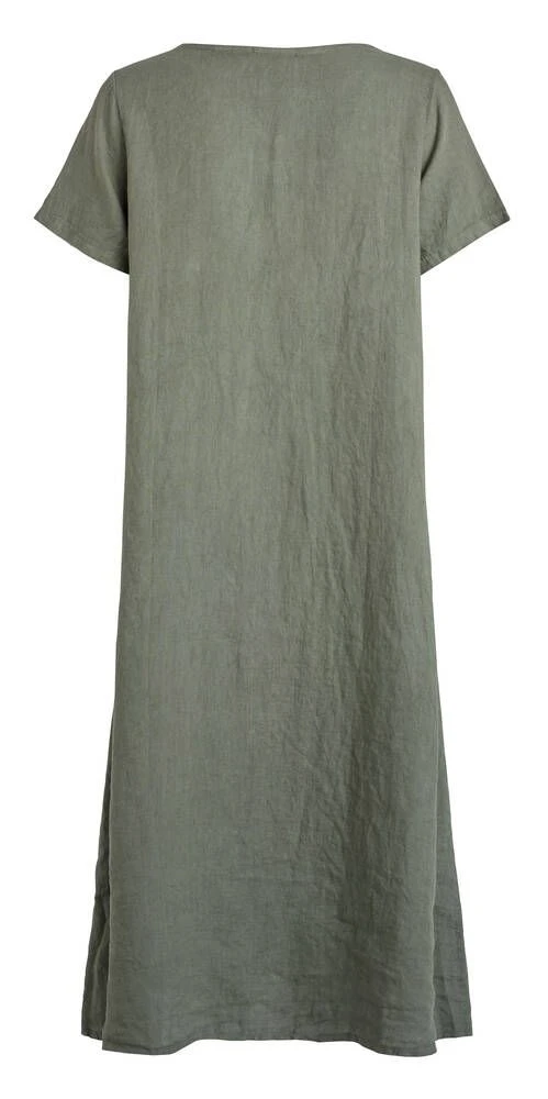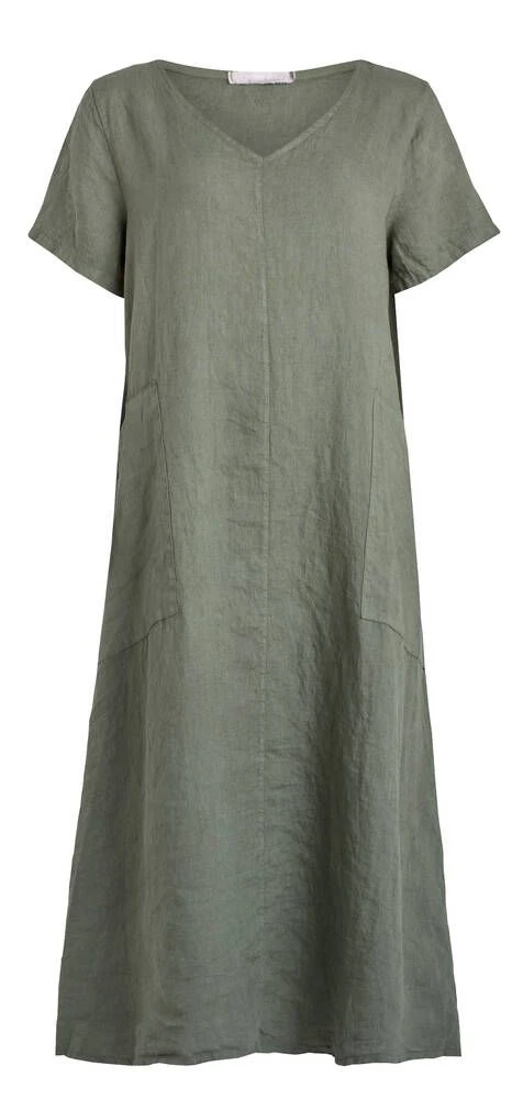 Naisten A-linjainen ja pitkänmallinen pellavamekko V-pääntiellä ja lyhyillä hihoilla. Etupuolella on tilavat paikkataskut.