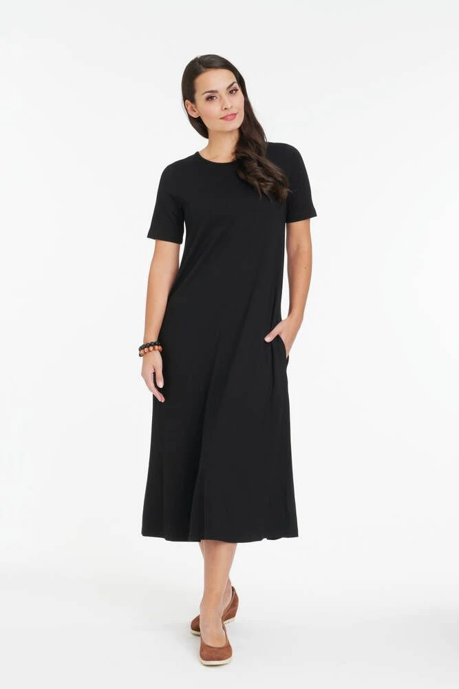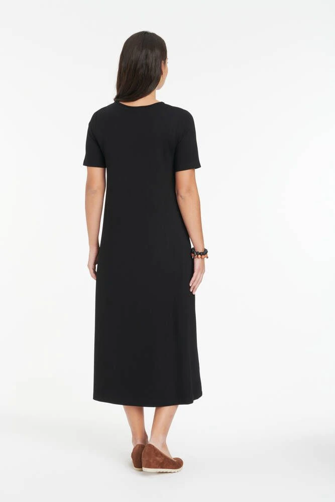 Rento pohjemittainen trikoomekko lyhyillä hihoilla ja huomaamattomilla etutaskuilla.