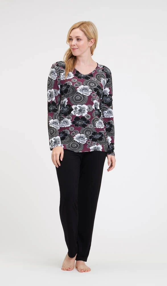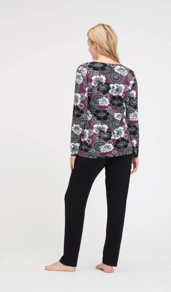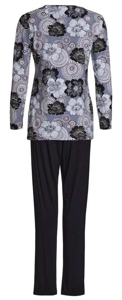 Miellyttävän joustava trikoopyjama yläosan maanläheisellä kukkakuosilla ja yksivärisillä housuilla. Paidassa on pitkät hihat ja housuissa joustava kuminauhavyötärö.