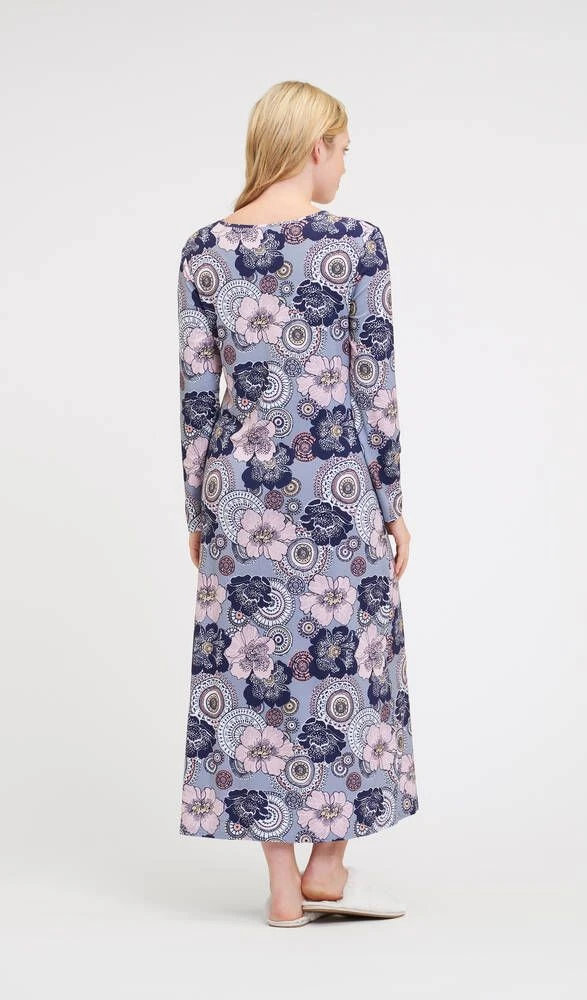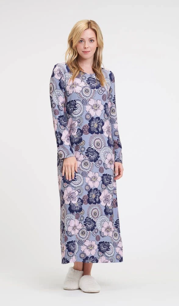 Naisten pitkä, kukallinen yöpaita pitkillä hihoilla.