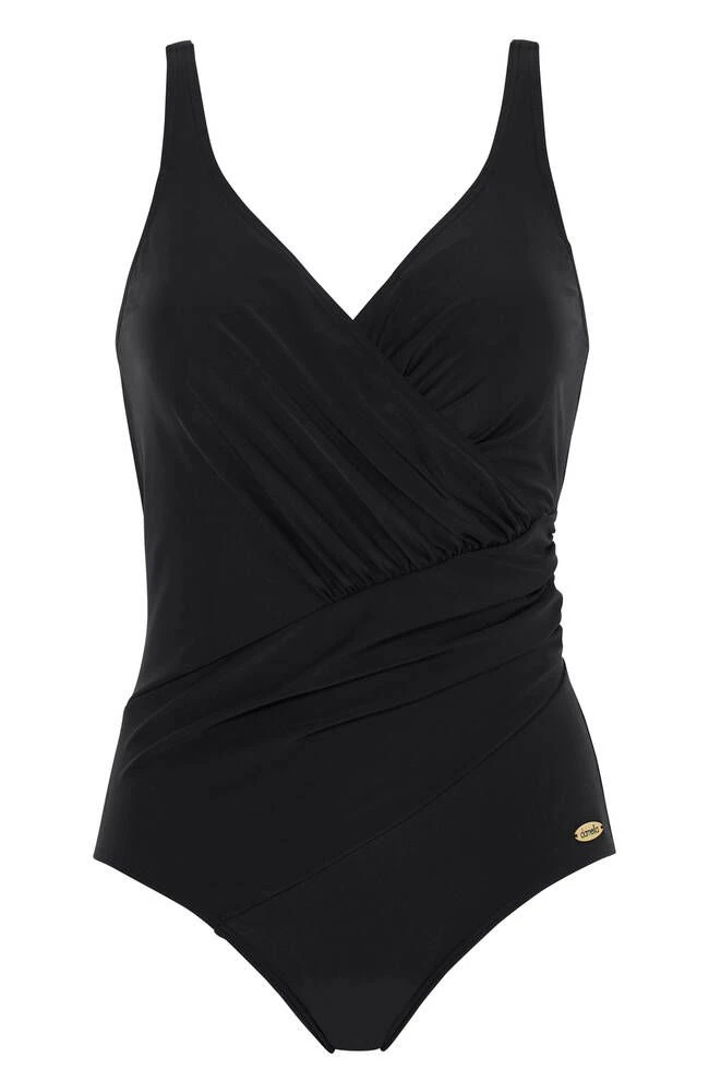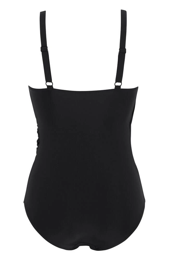 Naisten kietaisumallinen uimapuku vyötärön armollisilla rypytyksillä. Yksivärisessä uimapuvussa on lisäksi säädettävät olkaimet.