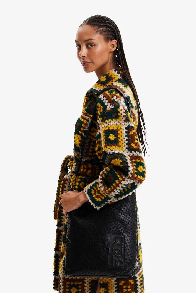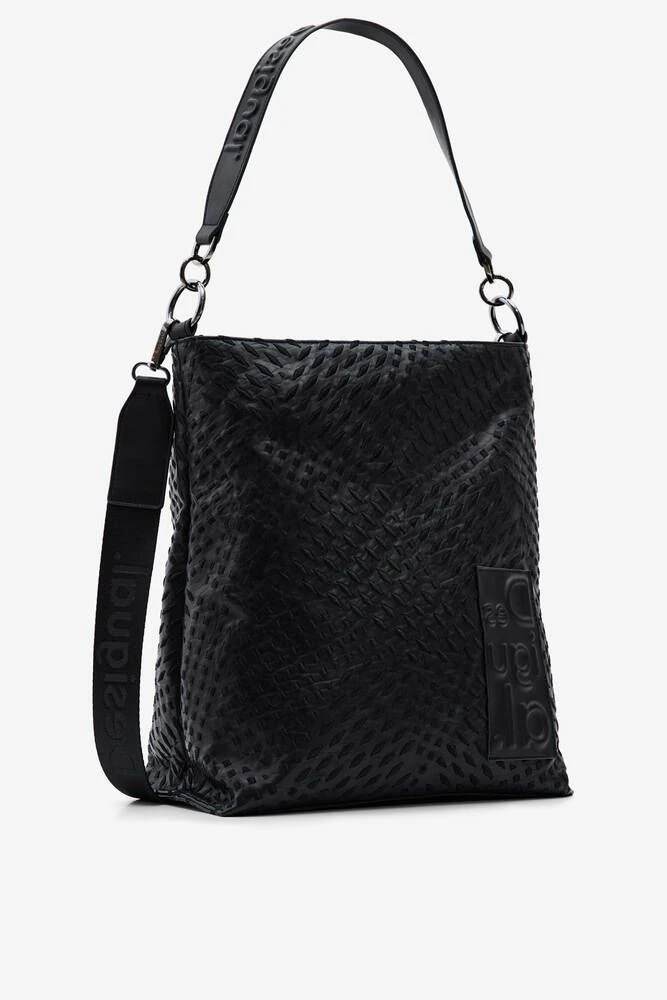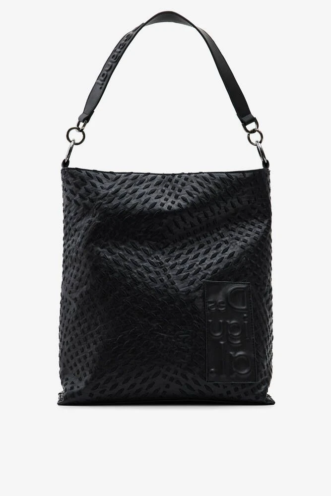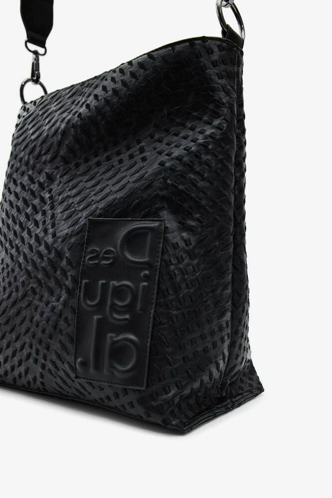 Yksinkertaisen tyylikäs laukku, jossa on pientä brodeerauskuviointia pinnassa ja Desigual-logo etupuolella.