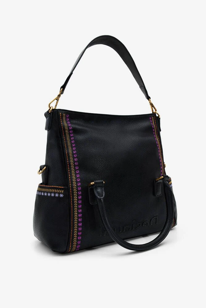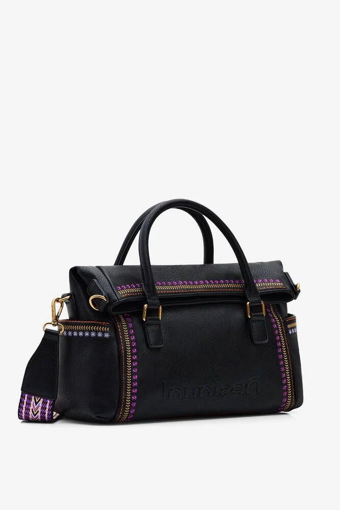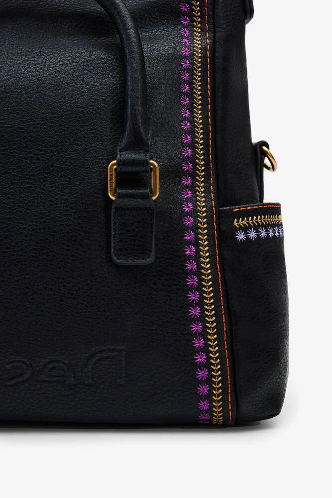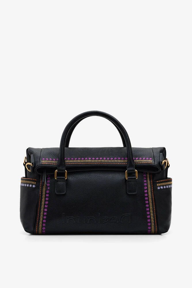 Monikäyttöinen laukku käännettävällä läpällä ja värikkäällä brodeerauksella. Laukussa on lyhyet kantohihnat, irroitettava lyhyt hihna sekä säädettävä ja irroitettava printtikangashihna.