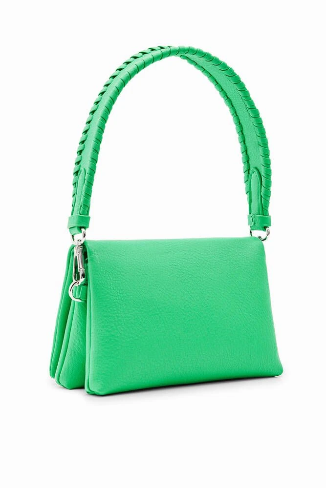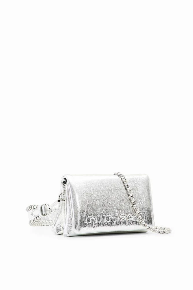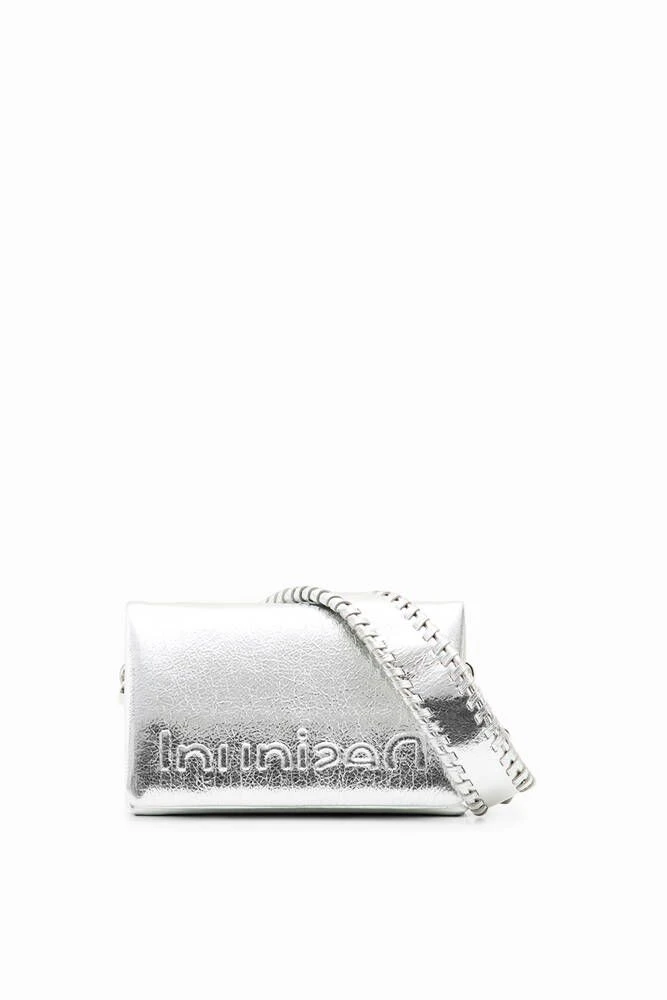 Minilaukku keinonahkasta, jossa läppä ja kaksi irrotettavaa kahvaa. Laukussa useita lokeroita ja taskuja.
