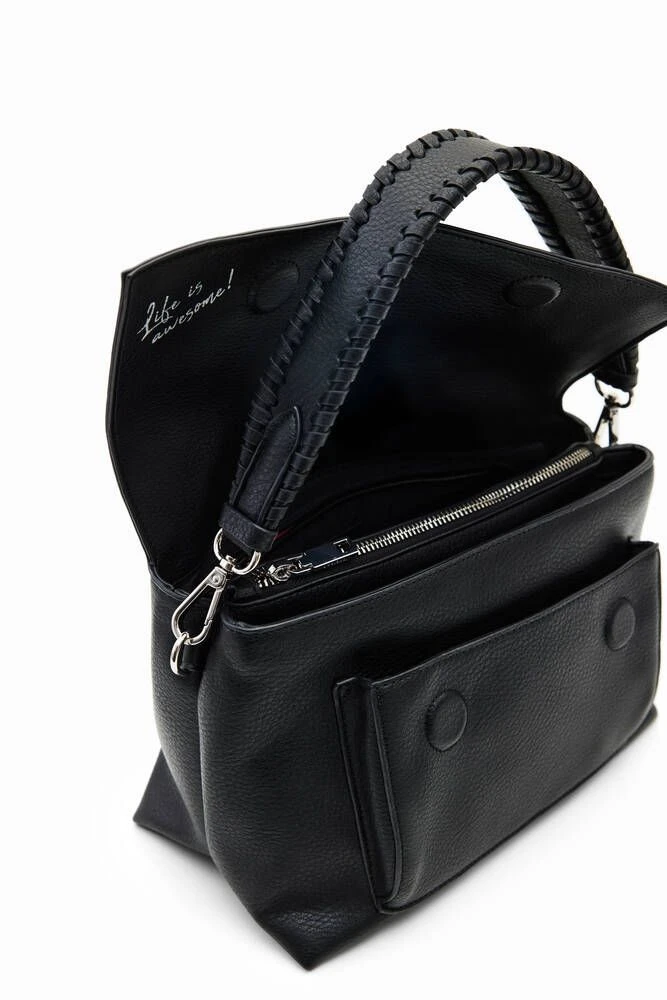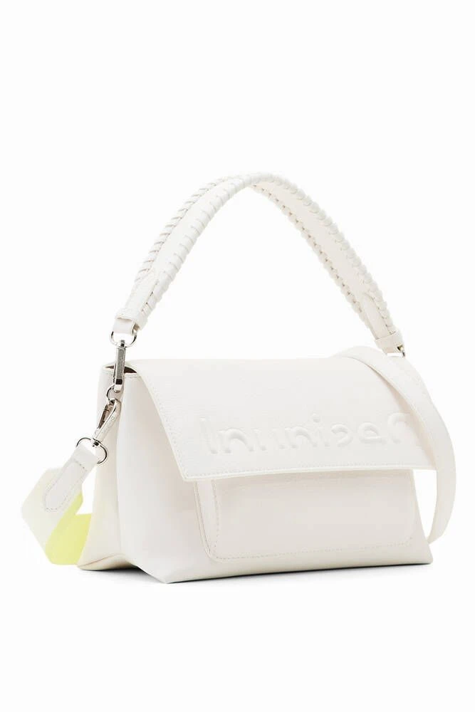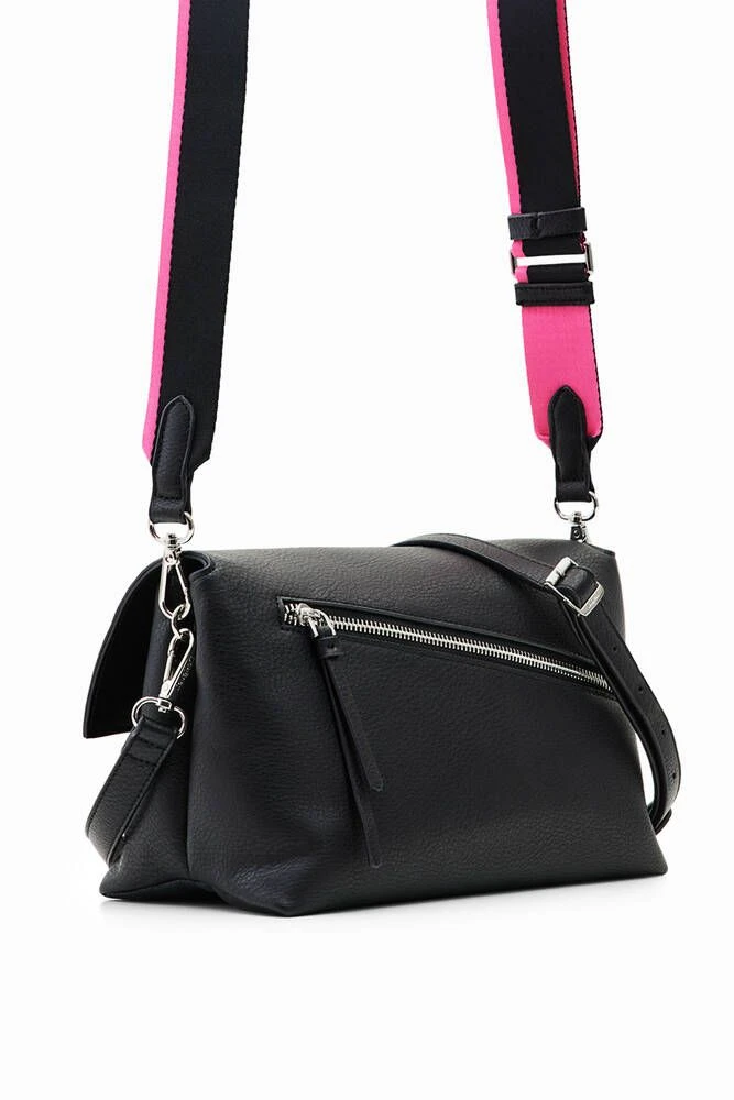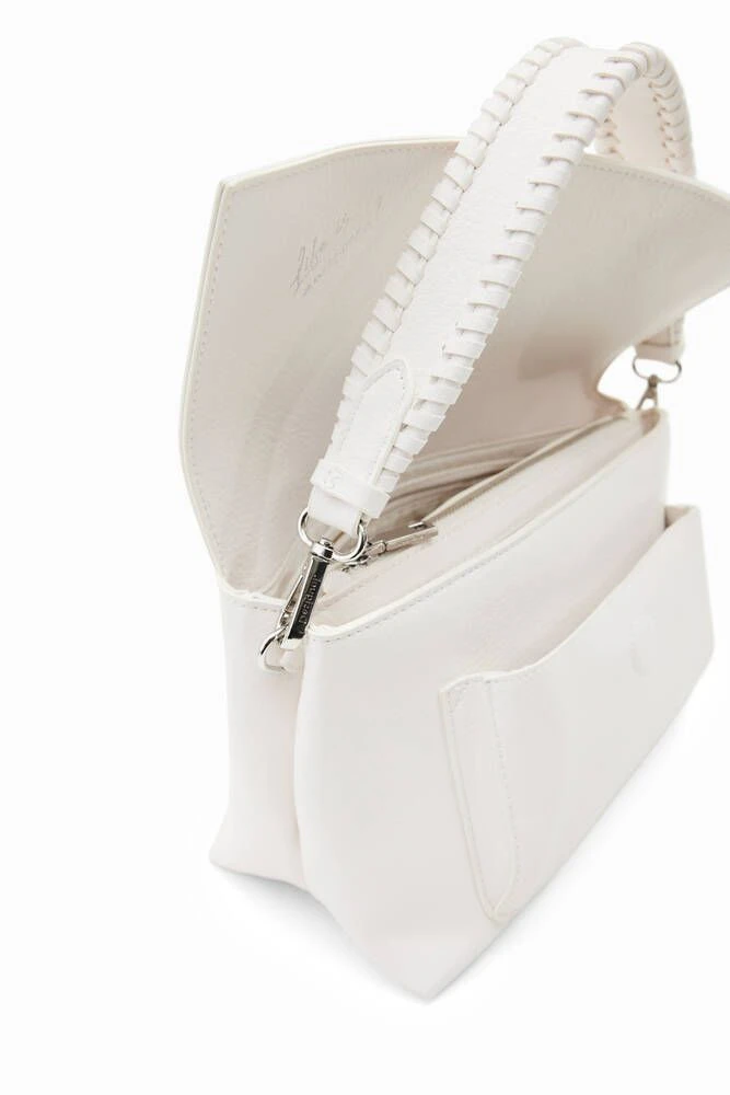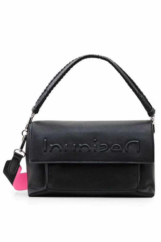 Crossbody-laukku nahkavaikutteisesta kankaasta, jossa on kohokuvioitu puolilogo, läppä sekä useita lokeroita ja taskuja.