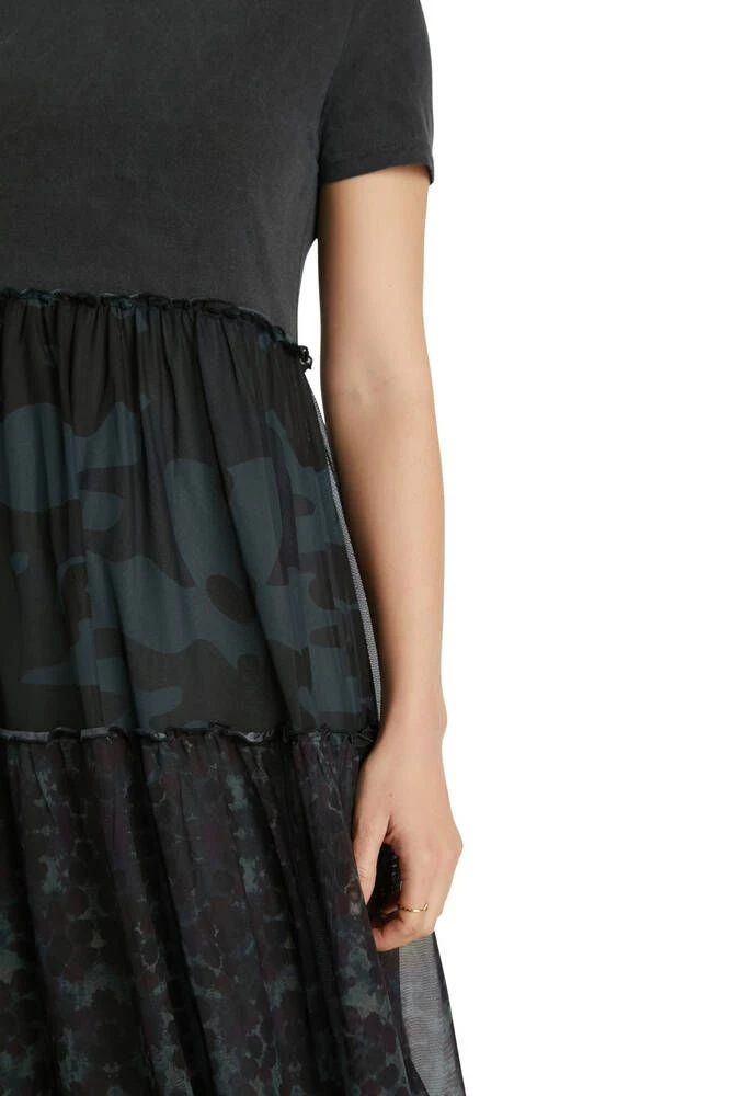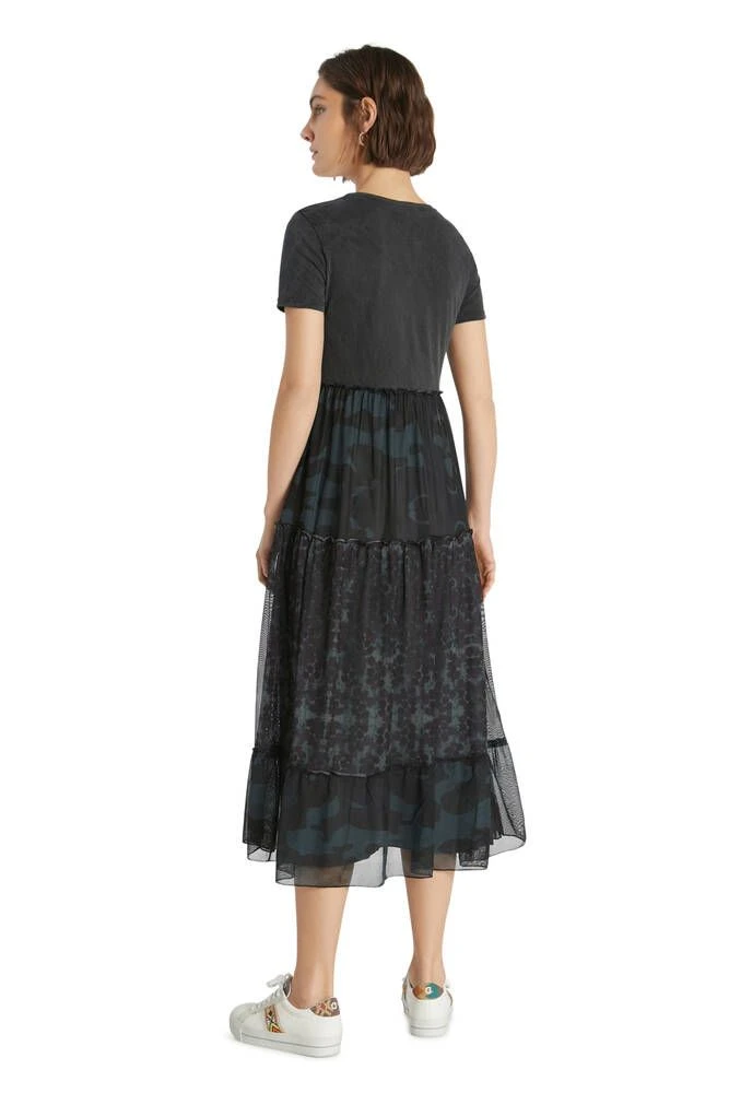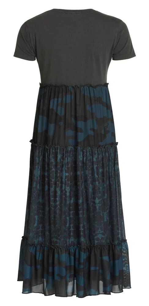 Ihanan joustava midimittainen mekko pyöreällä pääntiellä ja lyhyillä hihoilla. Monikäyttöisessä mekossa on yksivärinen yläosa sekä printattu mesh-kankainen alaosa.