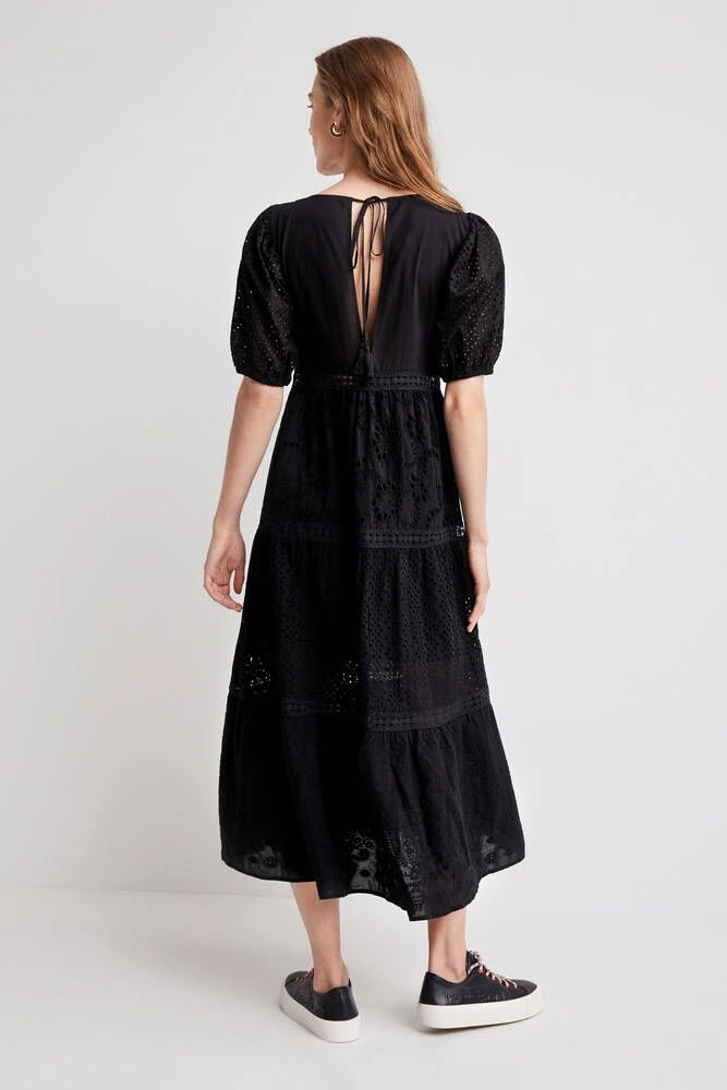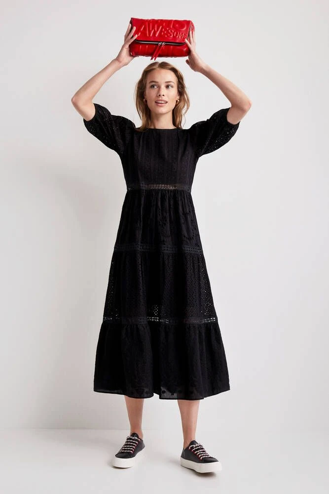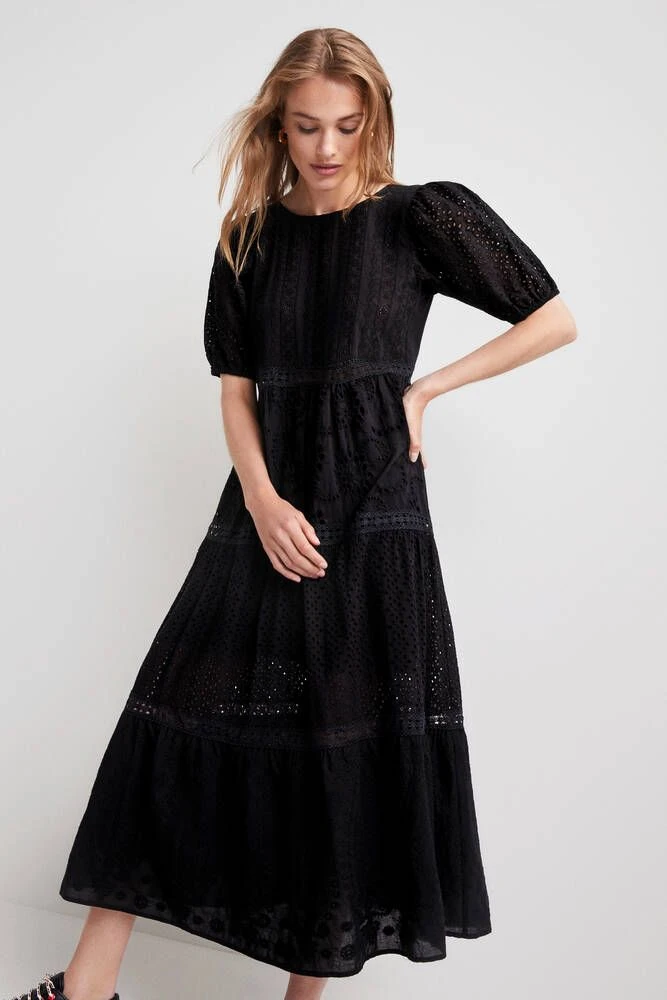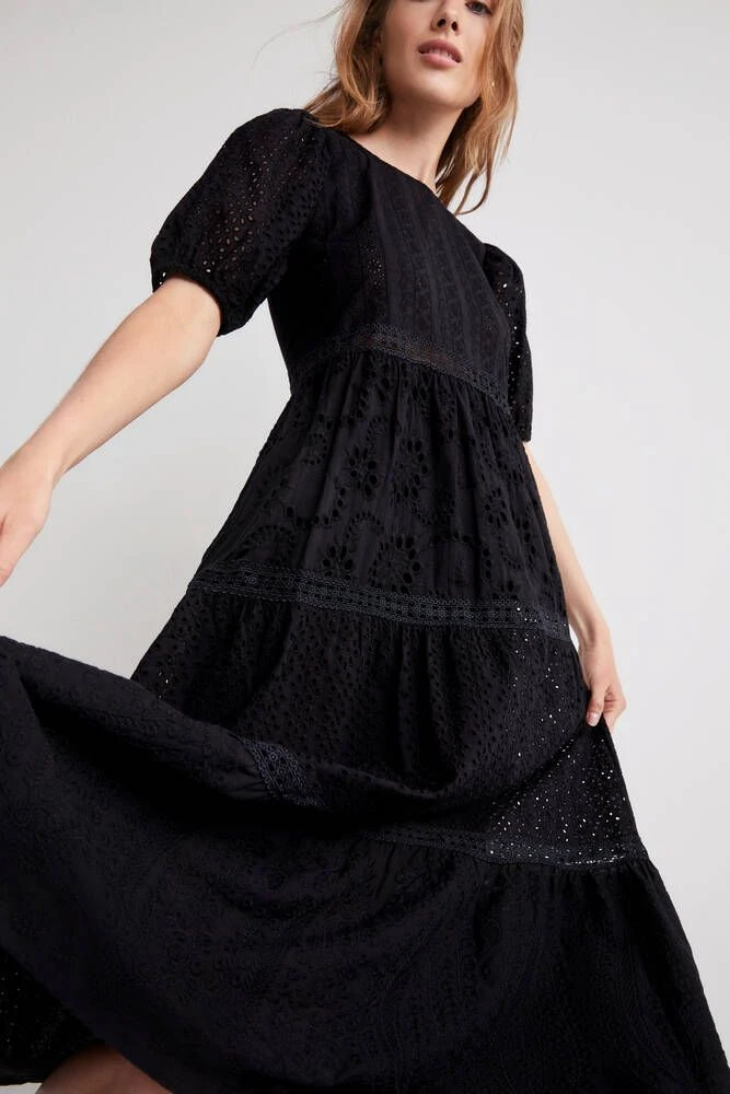Tyylikäs puuvillapitsimekko rypytetyillä helmasaumoilla ja lyhyillä puhvihihoilla. Mekossa on läpikuultava yläosa.