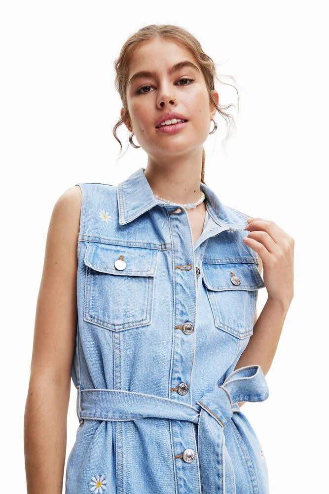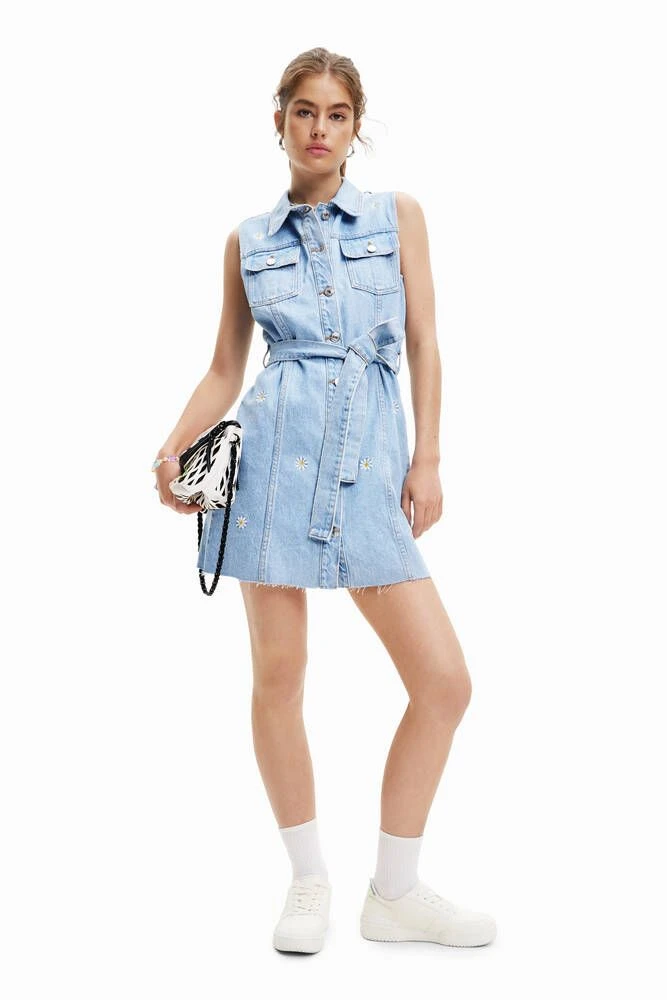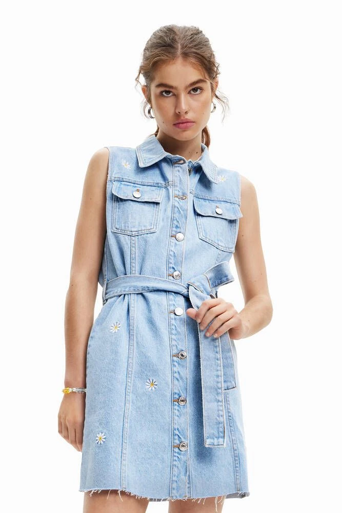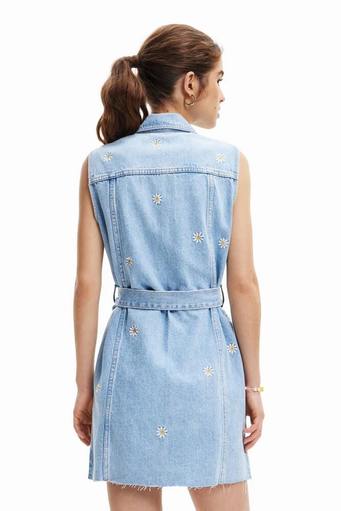 Naisten hihaton farkkumekko brodeeratuilla päivänkakkaroilla.