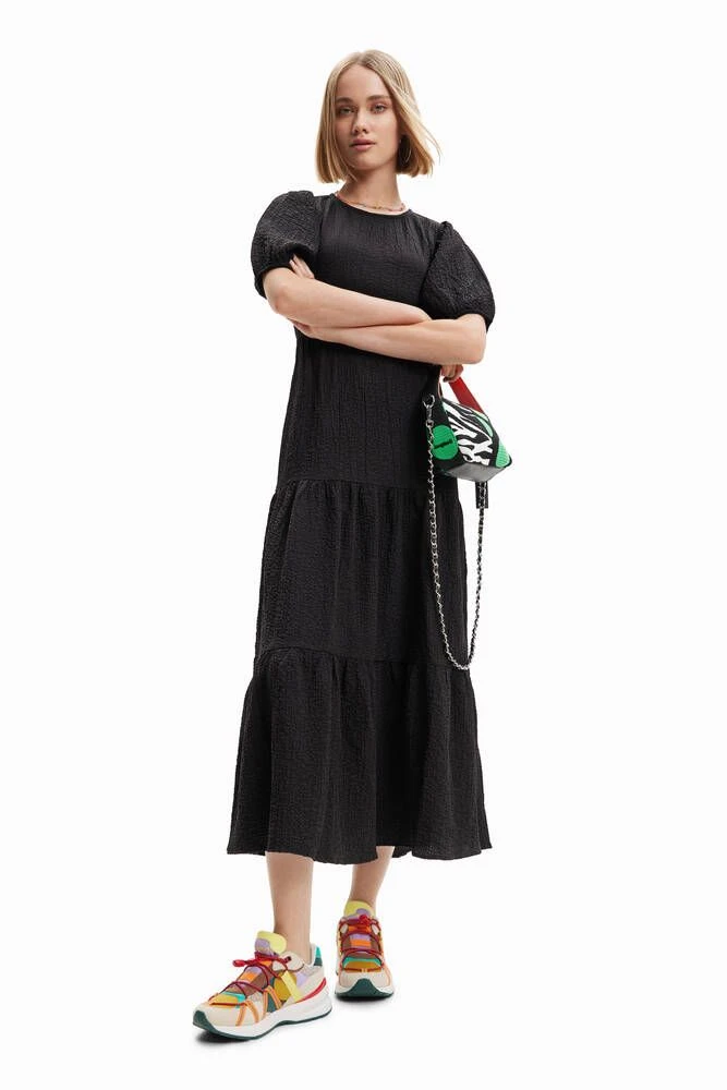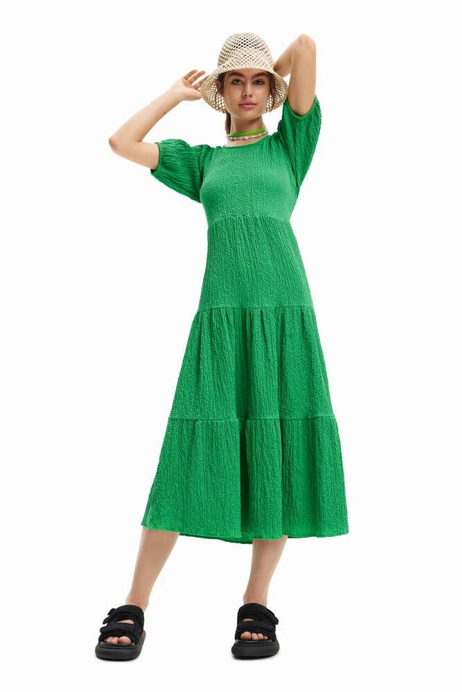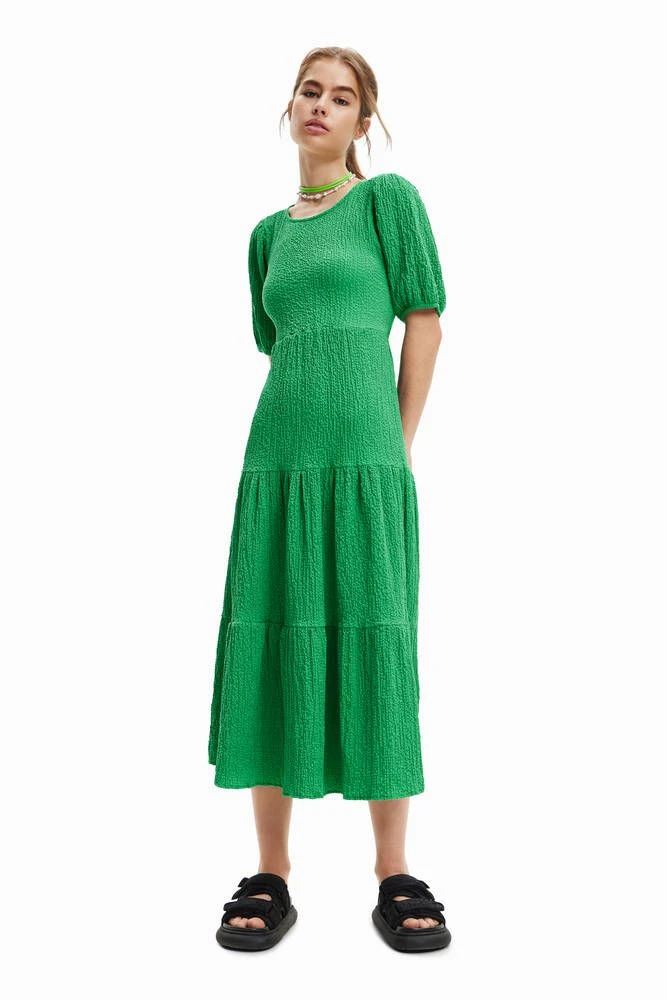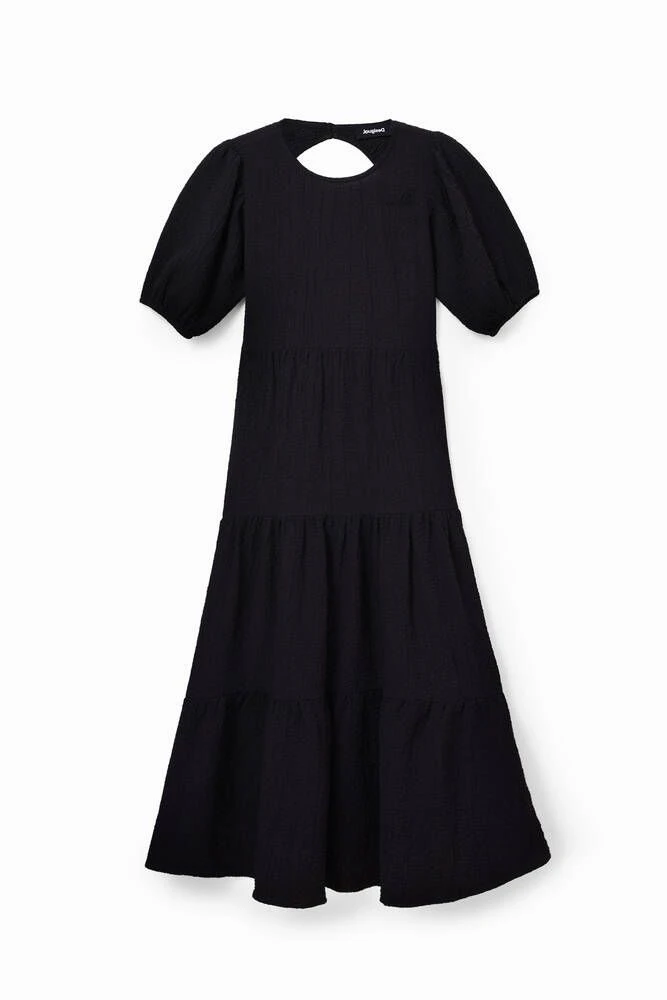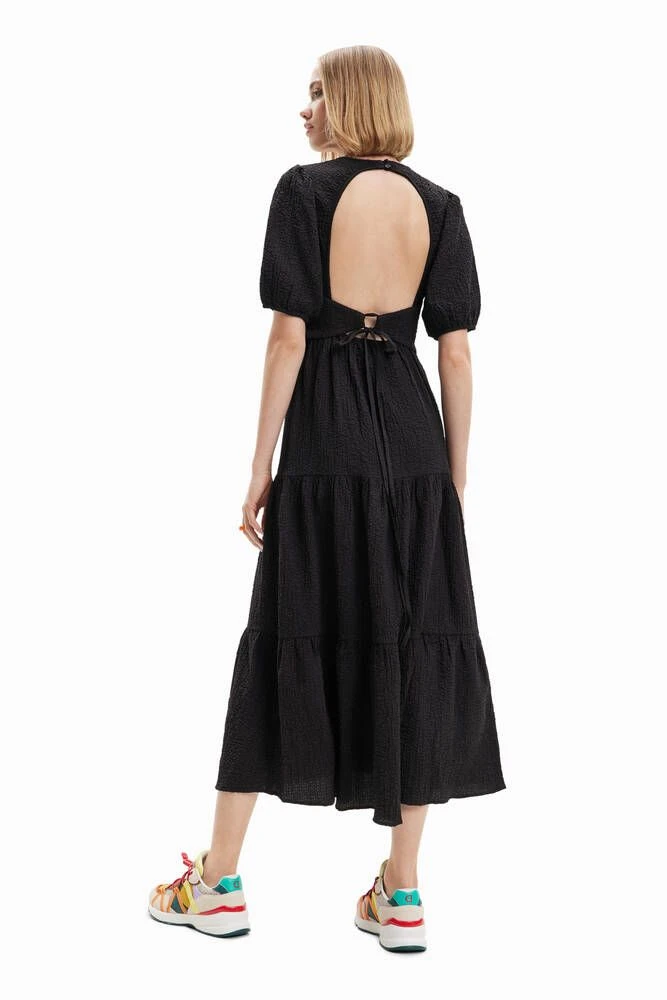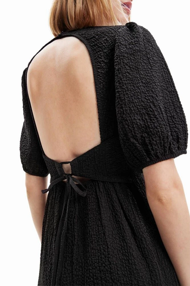 Naisten midi-mekko lyhyillä puhvihihoilla ja avonaisella selällä.