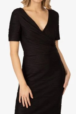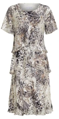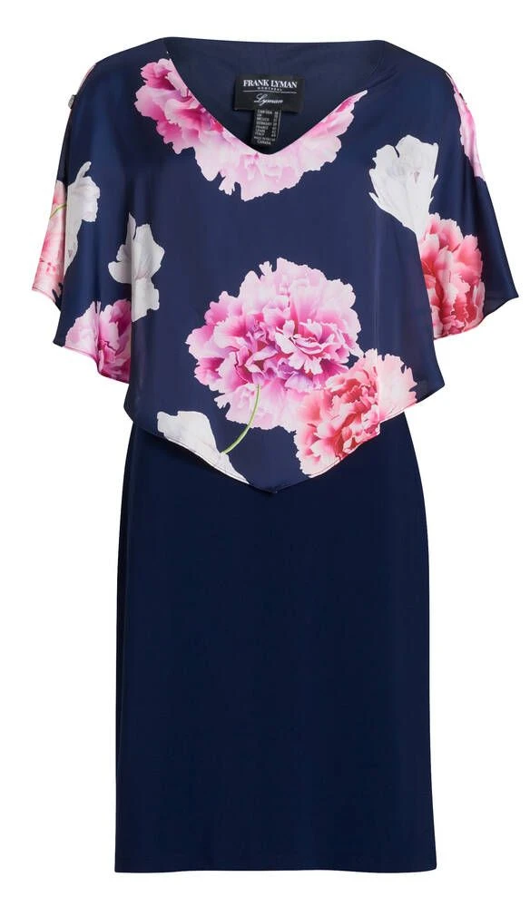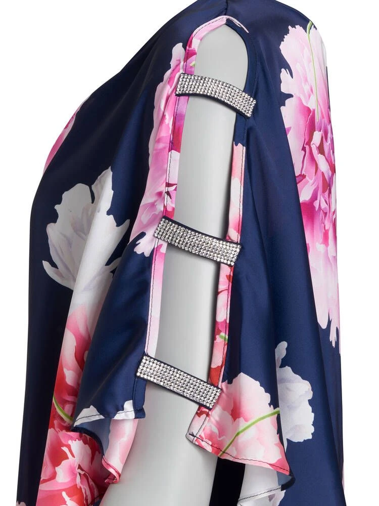 Naisten juhlamekko joustavasta materiaalista. Mekossa on yläosassa kukkakuosinen poncho, jossa on hihoissa strassikoristeita.