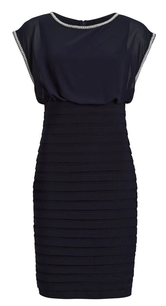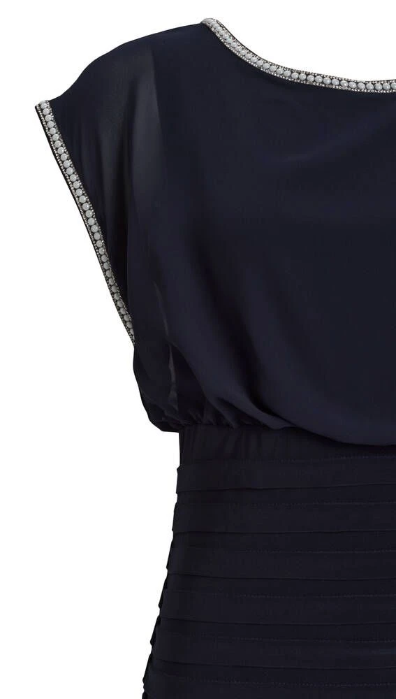 Naisten yksivärinen juhlamekko, jonka yläosa on kauniisti laskeutuvaa sifonkia ja alaosa paksua ja joustavaa trikoota. Kädensuissa on näyttävät koristekivet ja alaosassa vaakaraitastruktuurit. Selkäpuolen vetoketjukiinnitys helpottaa pukemista.