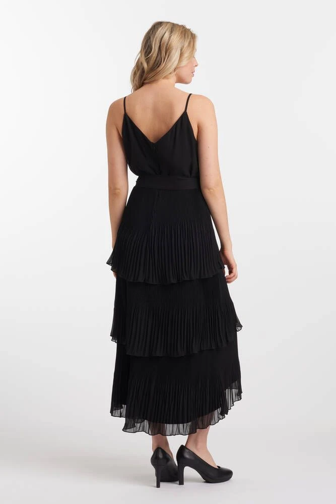 Naisten midimittainen juhlamekko ihanalla pliseeratulla kerroshelmalla. Yksivärisessä mekossa on kapeat naruolkaimet sekä vyötäröllä solmittava vyö.