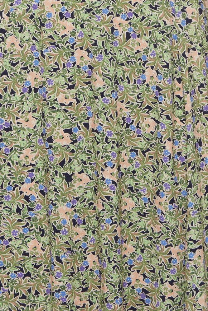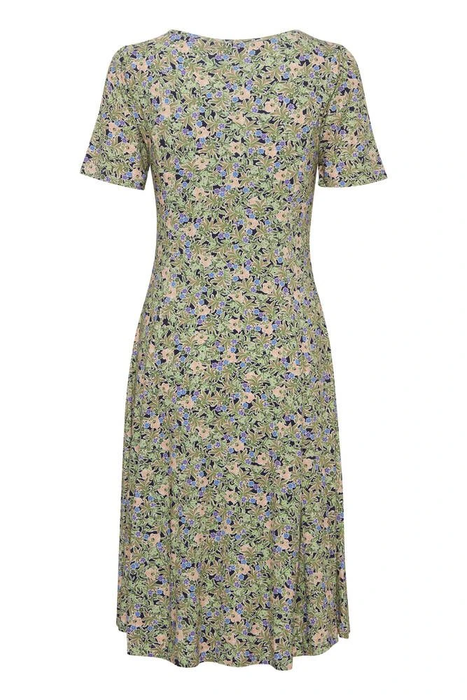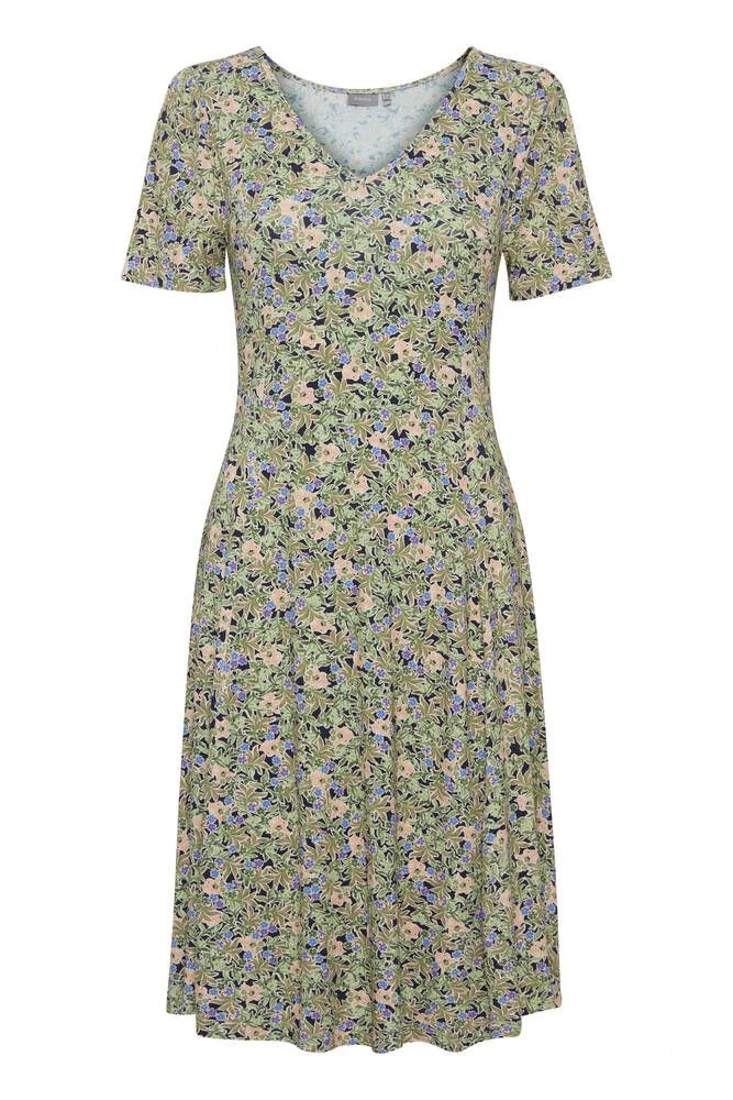 Naisten kukallinen trikoomekko v-pääntiellä ja kellohelmalla.