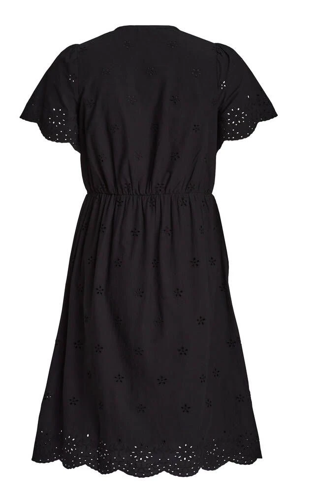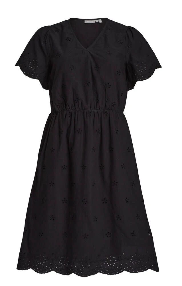 Naisten ihana puuvillapitsimekko V-pääntiellä ja lyhyillä hihoilla. Vyötäröllä on muotoa antava kuminauhakiristys.
