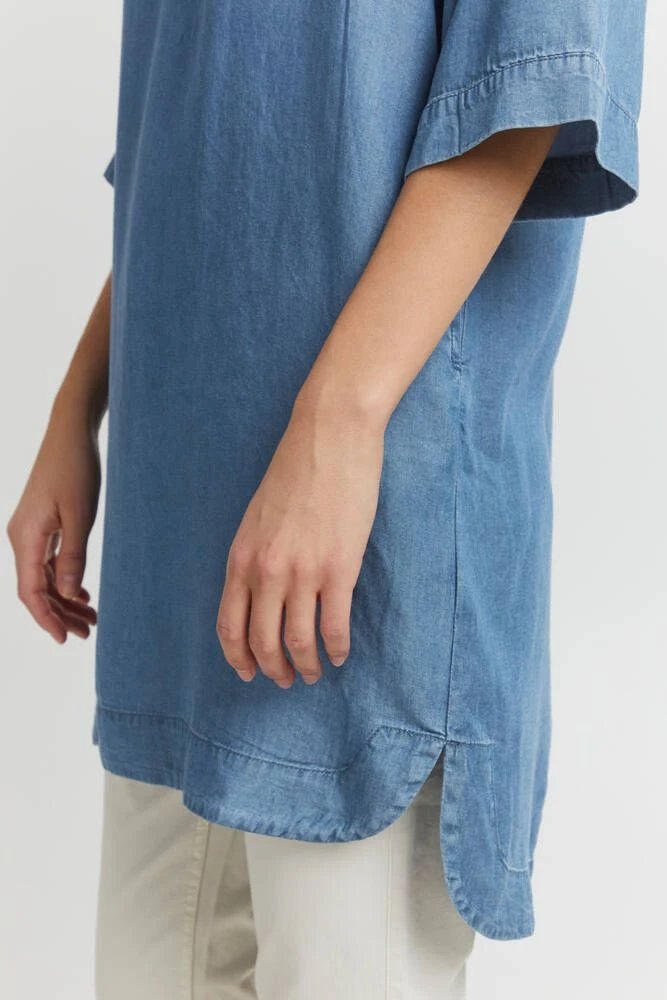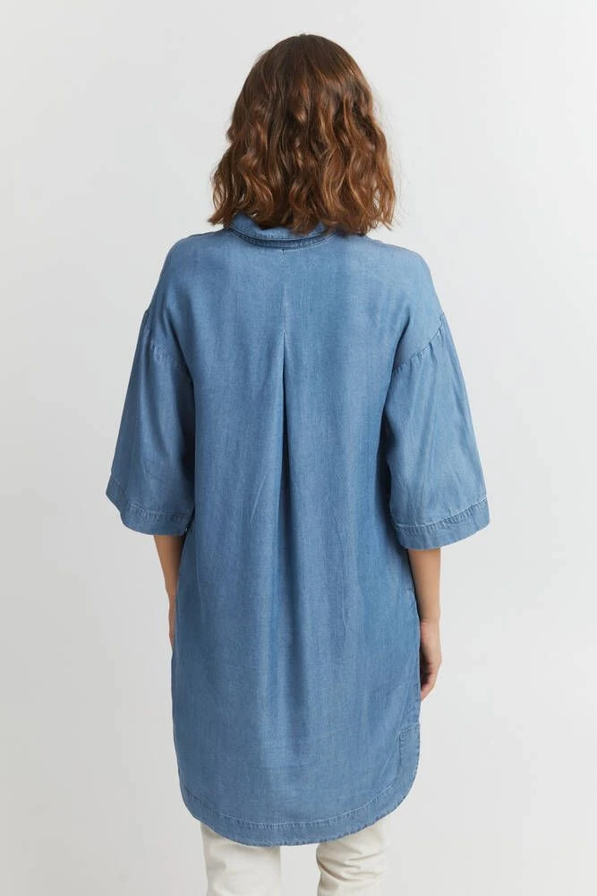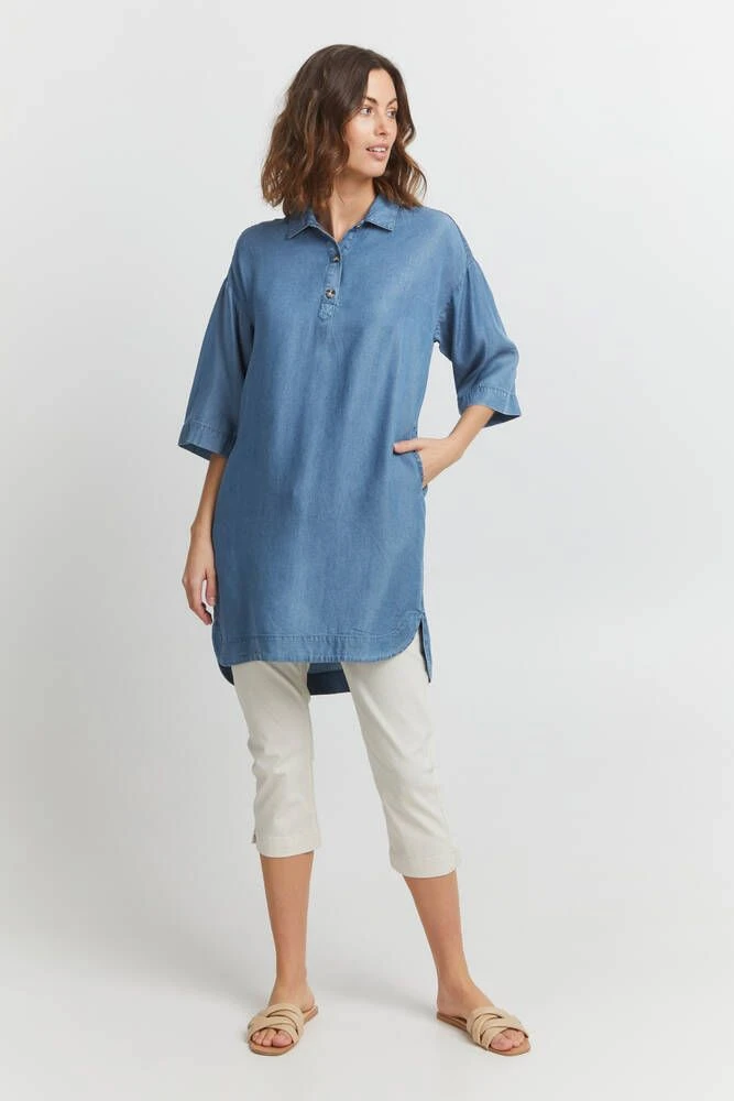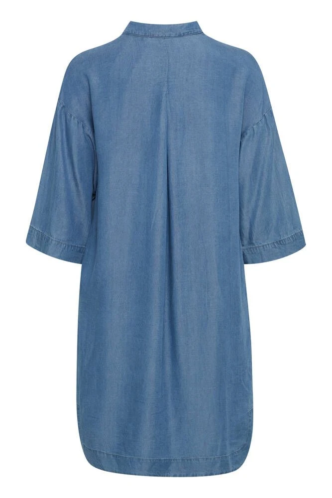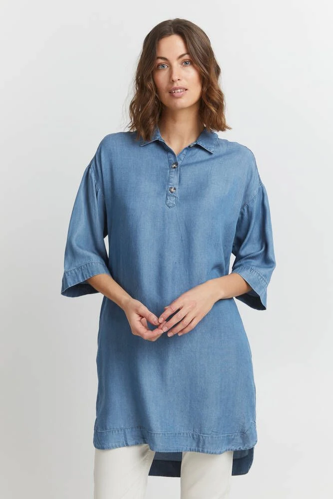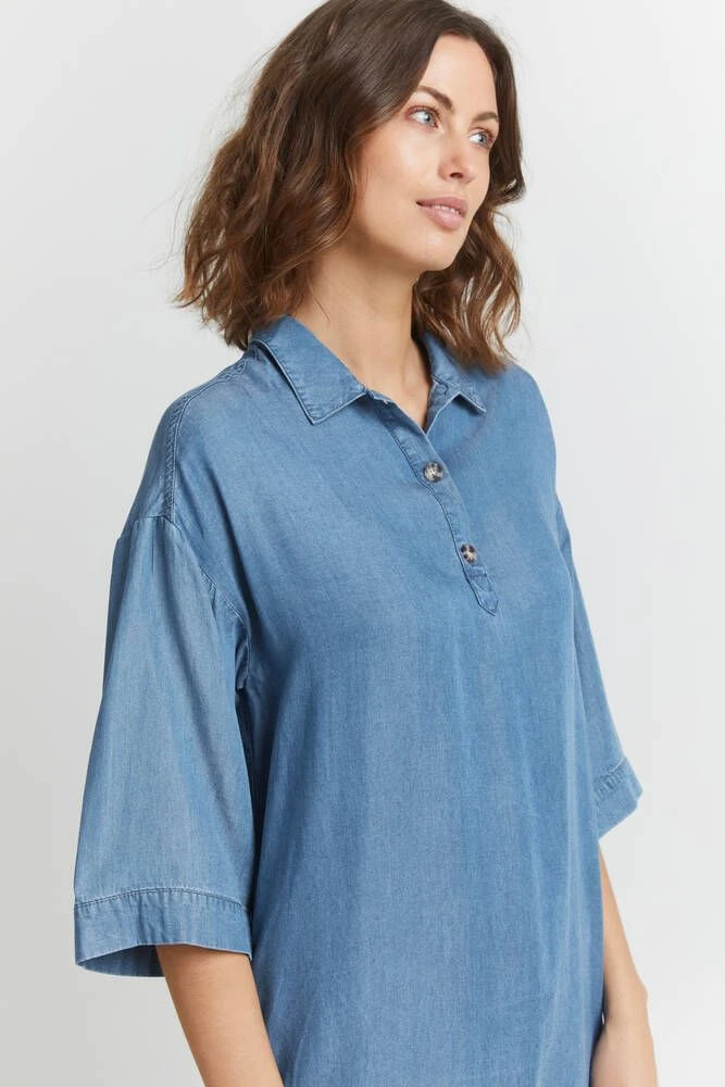 Naisten ihana tencel-farkkumekko kauluksilla ja pääntien puolinapituksella. Mekossa on tyylikkäät vajaamittaiset hihat.