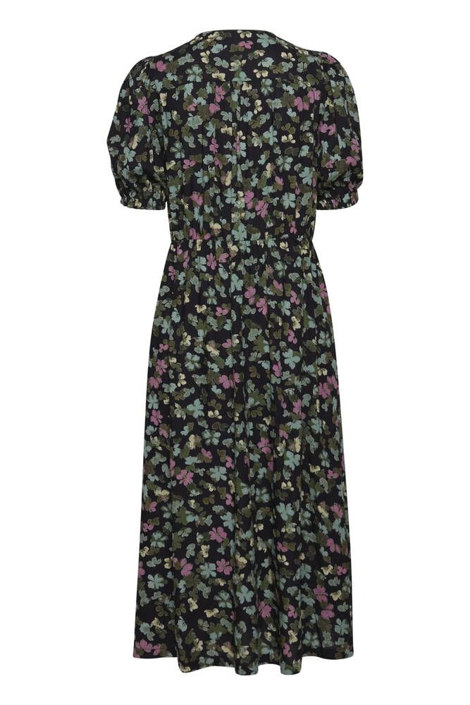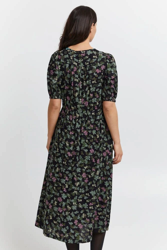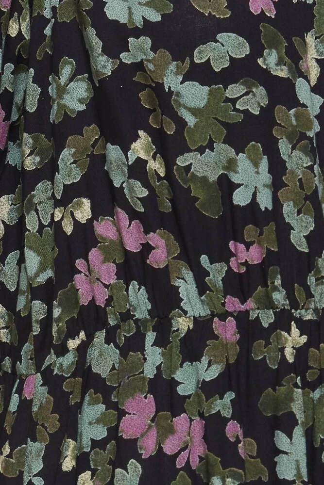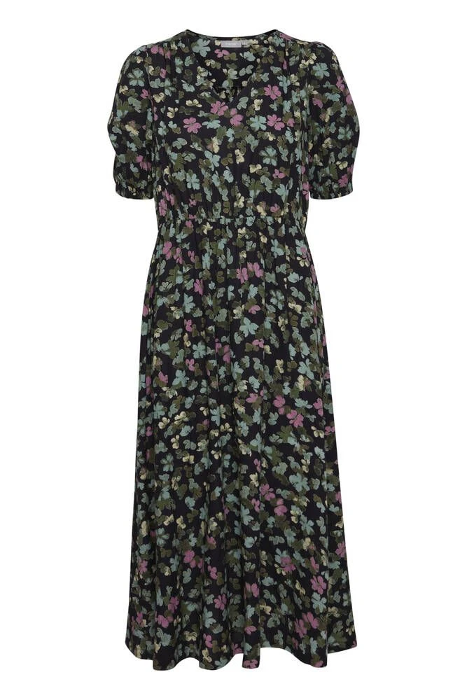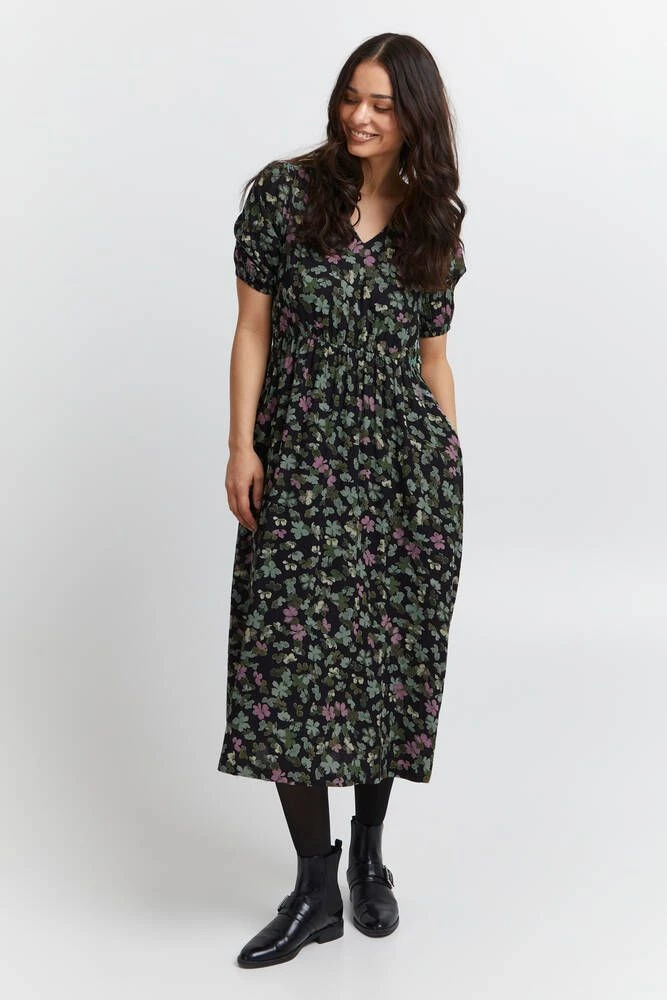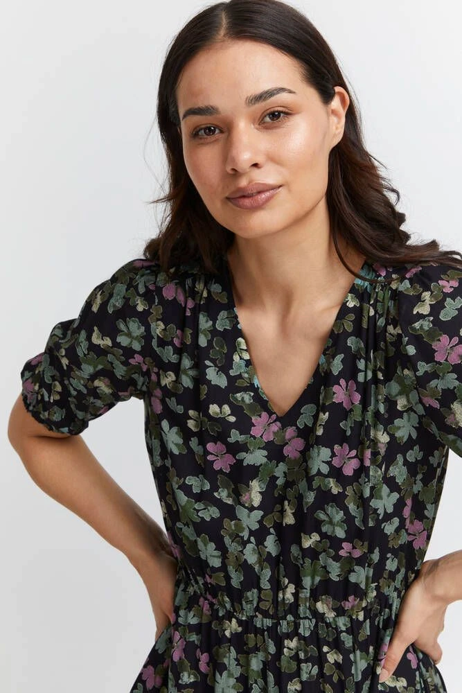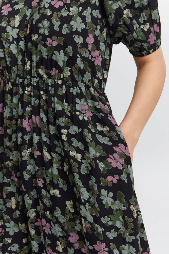 Naisten ihana kuosillinen midimekko, joka on valmistettu miellyttävästä viskoosista. Hihansuissa ja vyötäröllä on tyylikkäät kuminauhakiristykset. Edessä on lisäksi kätevät avotaskut.