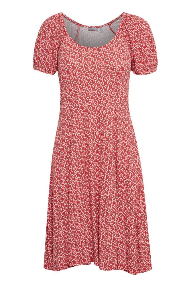 Naisten joustava trikoomekko pienellä kukkakuosilla ja lyhyillä hihoilla. Hihansuissa on tyylikkäät kuminauhakiristykset. Ihana kellohelma viimeistelee kokonaisuuden.