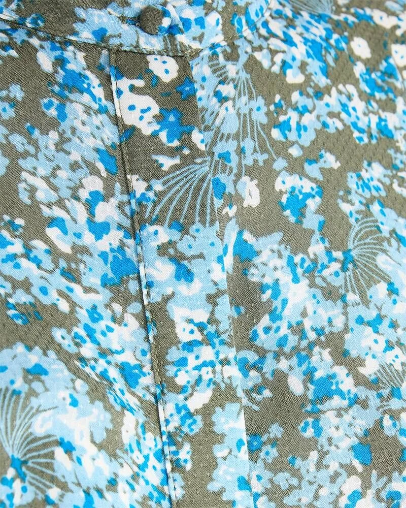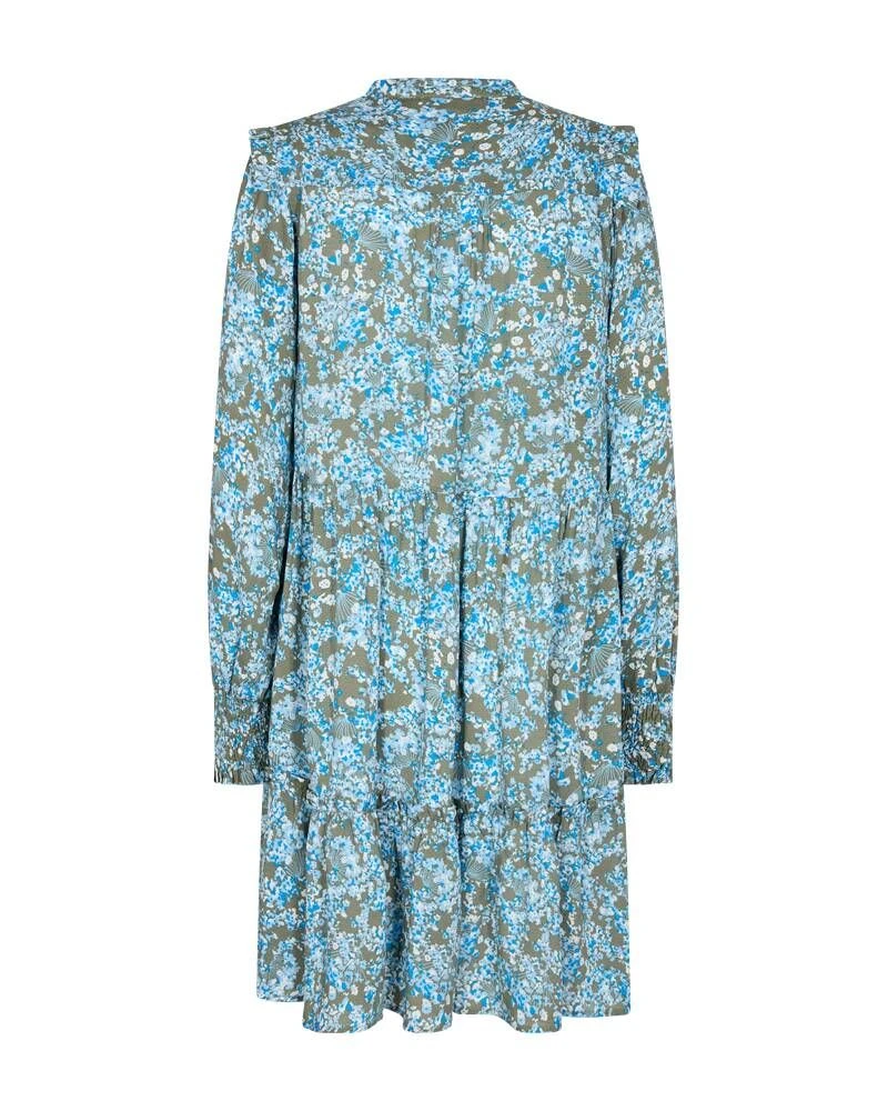 Naisten kukallinen röhelömekko pitkillä hihoilla. Mekossa on puolinapitus.