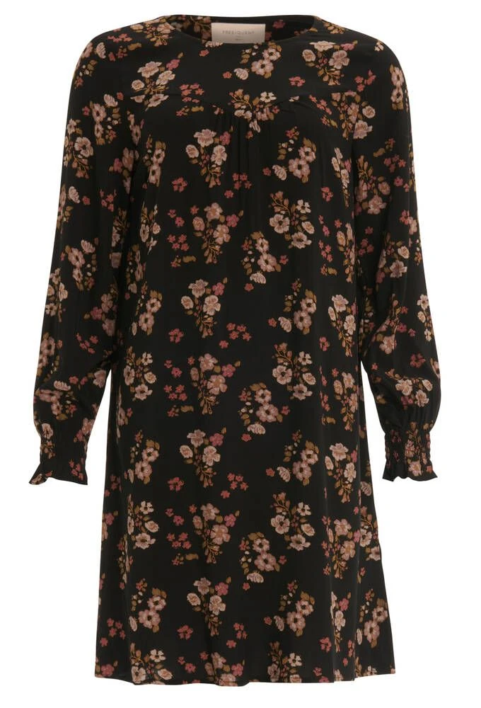 Naisten kukkakuosinen viskoosimekko pyöreällä pääntiellä ja pitkillä hihoilla. Hihansuissa on tyylikkäät smokkirypytykset.