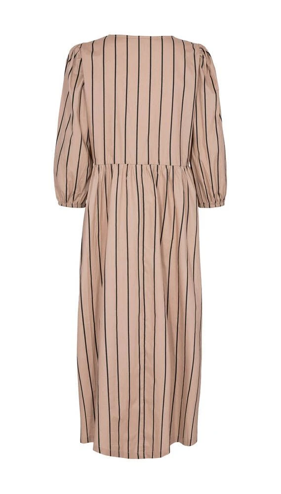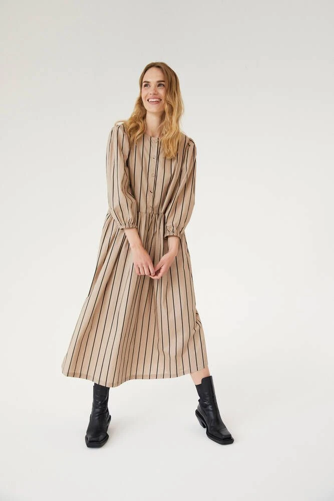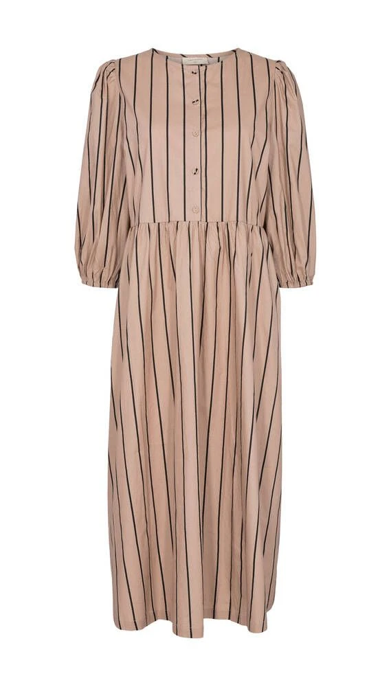 Ihana puuvillamekko pyöreällä pääntiellä ja väljillä hihoilla. Pääntieltä lähtee vyötärösaumaan ulottuva nappikaistale.